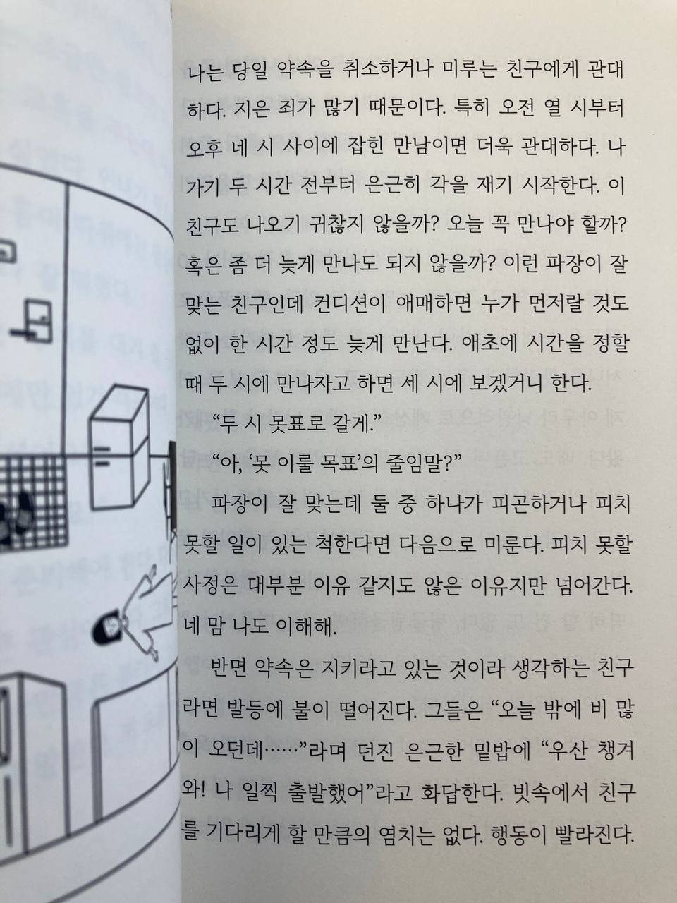 나는 당일 약속을 취소하거나 미루는 친구에게 관대하다. 지은 죄가 많기 때문이다. 특히 오전 열 시부터 오후 네 시 사이에 잡힌 만남이면 더욱 관대하다. 나가기 두 시간 전부터 은근히 각을 재기 시작한다. 이 친구도 나오기 귀찮지 않을까? 오늘 꼭 만나야 할까? 혹은 좀 더 늦게 만나도 되지 않을까? 이런 파장이 잘 맞는 친구인데 컨디션이 애매하면 누가 먼저랄 것도 없이 한 시간 정도 늦게 만난다. 애초에 시간을 정할 때 두 시에 만나자고 하면 세 시에 보겠거니 한다.