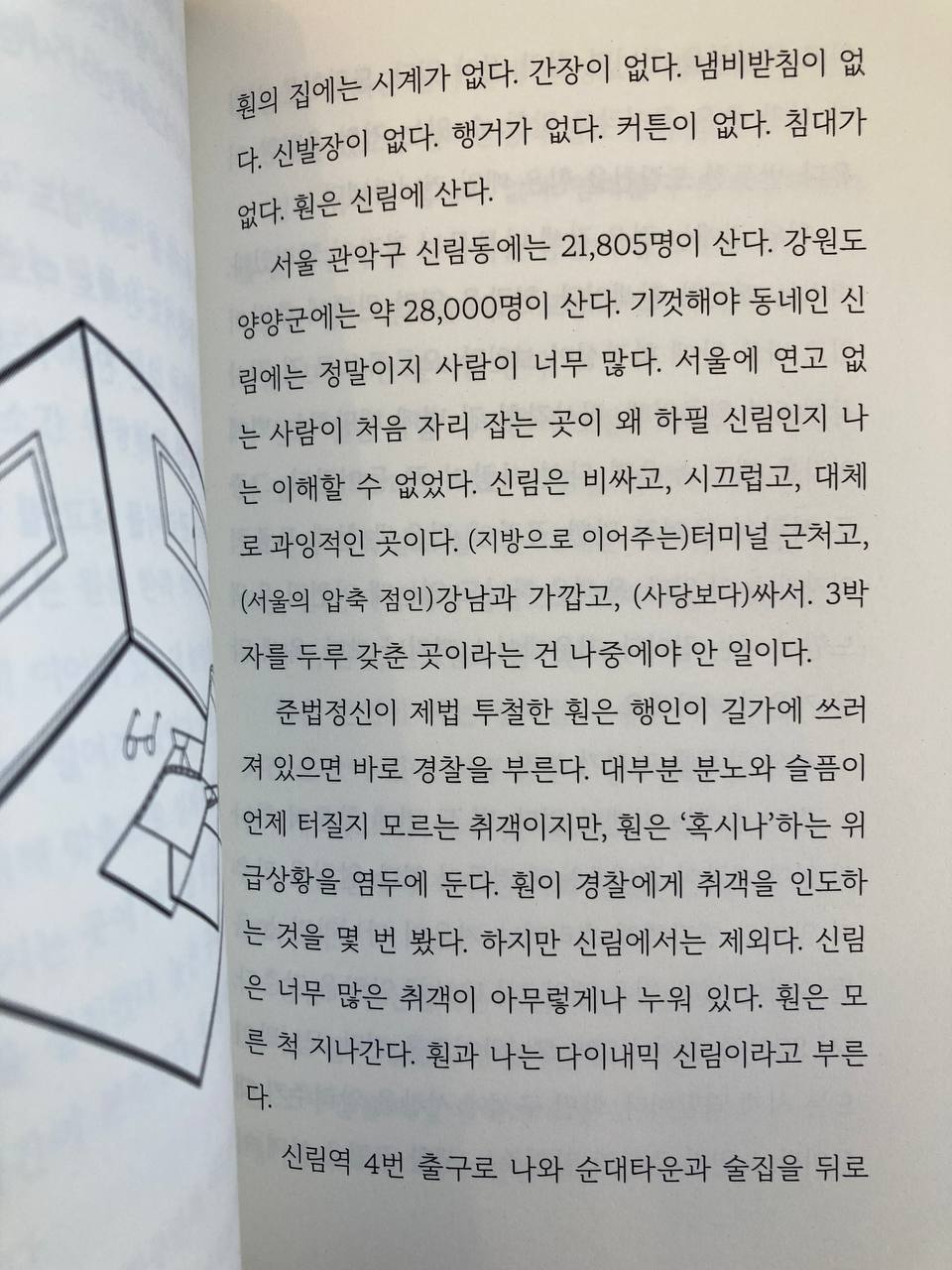 서울 관악구 신림동에는 21,805명이 산다. 강원도 양양군에는 약 28,000명이 산다. 기껏해야 동네인 신림에는 정말이지 사람이 너무 많다. 서울에 연고 없는 사람이 처음 자리 잡는 곳이 왜 하필 신림인지 나는 이해할 수 없었다. 신림은 비싸고, 시끄럽고, 대체로 과잉적인 곳이다. (지방으로 이어주는)터미널 근처고, (서울의 압축 점인)강남과 가깝고, (사당보다)싸서. 3박자를 두루 갖춘 곳이라는 건 나중에야 안 일이다.