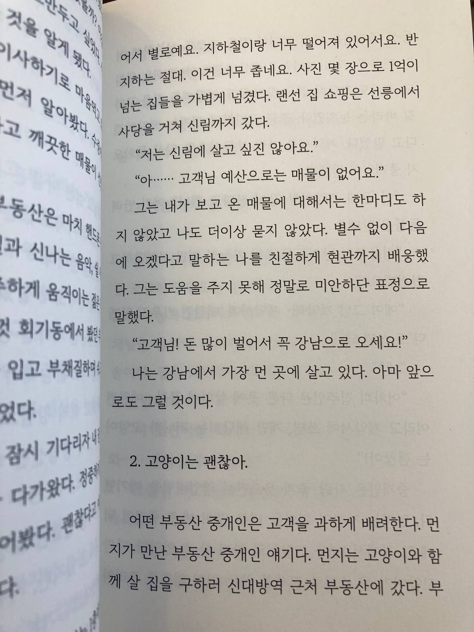 그는 내가 보고 온 매물에 대해서는 한마디도 하지 않았고 나도 더이상 묻지 않았다. 별수 없이 다음에 오겠다고 말하는 나를 친절하게 현관까지 배웅했다. 그는 도움을 주지 못해 정말로 미안하단 표정으로 말했다.