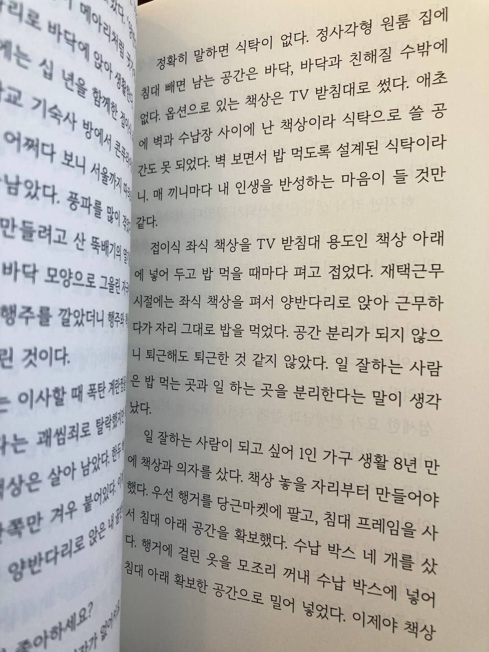 접이식 좌식 책상을 TV 받침대 용도인 책상 아래에 넣어 두고 밥 먹을 때마다 펴고 접었다. 재택근무 시절에는 좌식 책상을 펴서 양반다리로 앉아 근무하다가 자리 그대로 밥을 먹었다. 공간 분리가 되지 않으니 퇴근해도 퇴근한 것 같지 않았다. 일 잘하는 사람은 밥 먹는 곳과 일 하는 곳을 분리한다는 말이 생각났다.