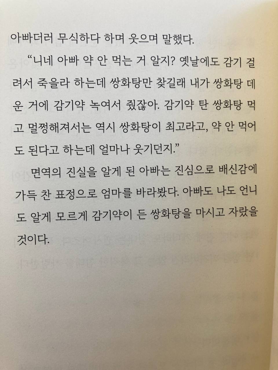 "니네 아빠 약 안 먹는 거 알지? 옛날에도 감기 걸 려서 죽을라 하는데 쌍화탕만 찾길래 내가 쌍화탕 데운 거에 감기약 녹여서 줬잖아. 감기약 탄 쌍화탕 먹고 멀쩡해져서는 역시 쌍화탕이 최고라고, 약 안 먹어도 된다고 하는데 얼마나 웃기던지.”