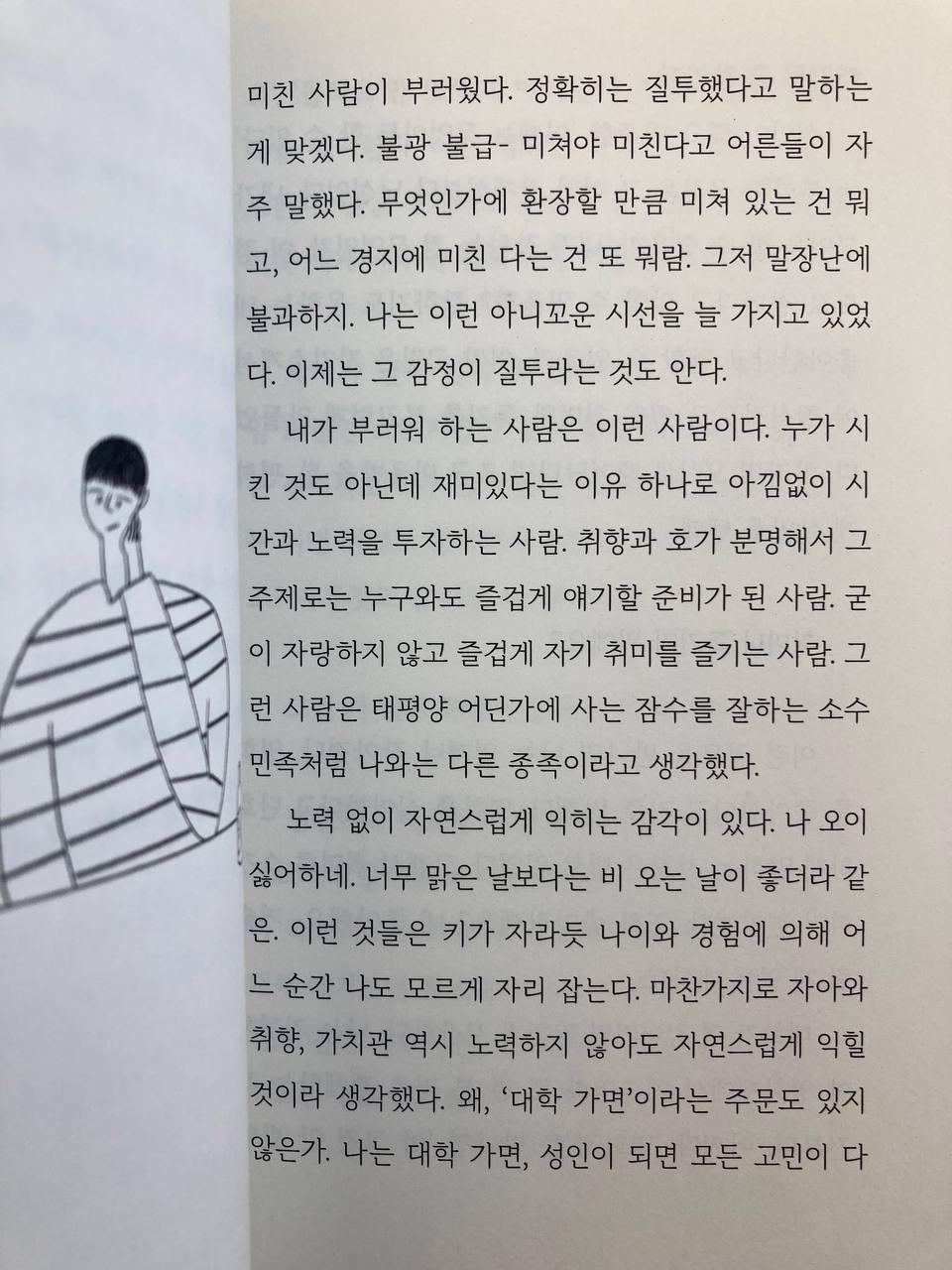 내가 부러워 하는 사람은 이런 사람이다. 누가 시킨 것도 아닌데 재미있다는 이유 하나로 아낌없이 시간과 노력을 투자하는 사람. 취향과 호가 분명해서 그 주제로는 누구와도 즐겁게 얘기할 준비가 된 사람. 굳 이 자랑하지 않고 즐겁게 자기 취미를 즐기는 사람. 그런 사람은 태평양 어딘가에 사는 잠수를 잘하는 소수 민족처럼 나와는 다른 종족이라고 생각했다. 노력 없이 자연스럽게 익히는 감각이 있다. 나 오이 싫어하네. 너무 맑은 날보다는 비 오는 날이 좋더라 같은. 이런 것들은 키가 자라듯 나이와 경험에 의해 어느 순간 나도 모르게 자리 잡는다. 마찬가지로 자아와 취향, 가치관 역시 노력하지 않아도 자연스럽게 익힐 것이라 생각했다. 왜, '대학 가면'이라는 주문도 있지 않은가. 나는 대학 가면, 성인이 되면 모든 고민이