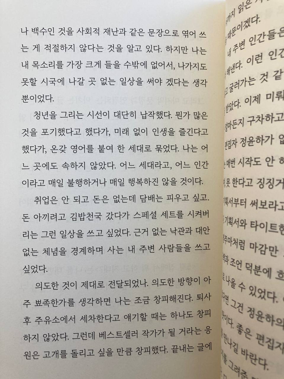 취업은 안 되고 돈은 없는데 담배는 피우고 싶고, 돈 아끼려고 김밥천국 갔다가 스페셜 세트를 시켜버리는 그런 일상을 쓰고 싶었다. 근거 없는 낙관과 대안 없는 체념을 경계하며 사는 내 주변 사람들을 쓰고 싶었다.