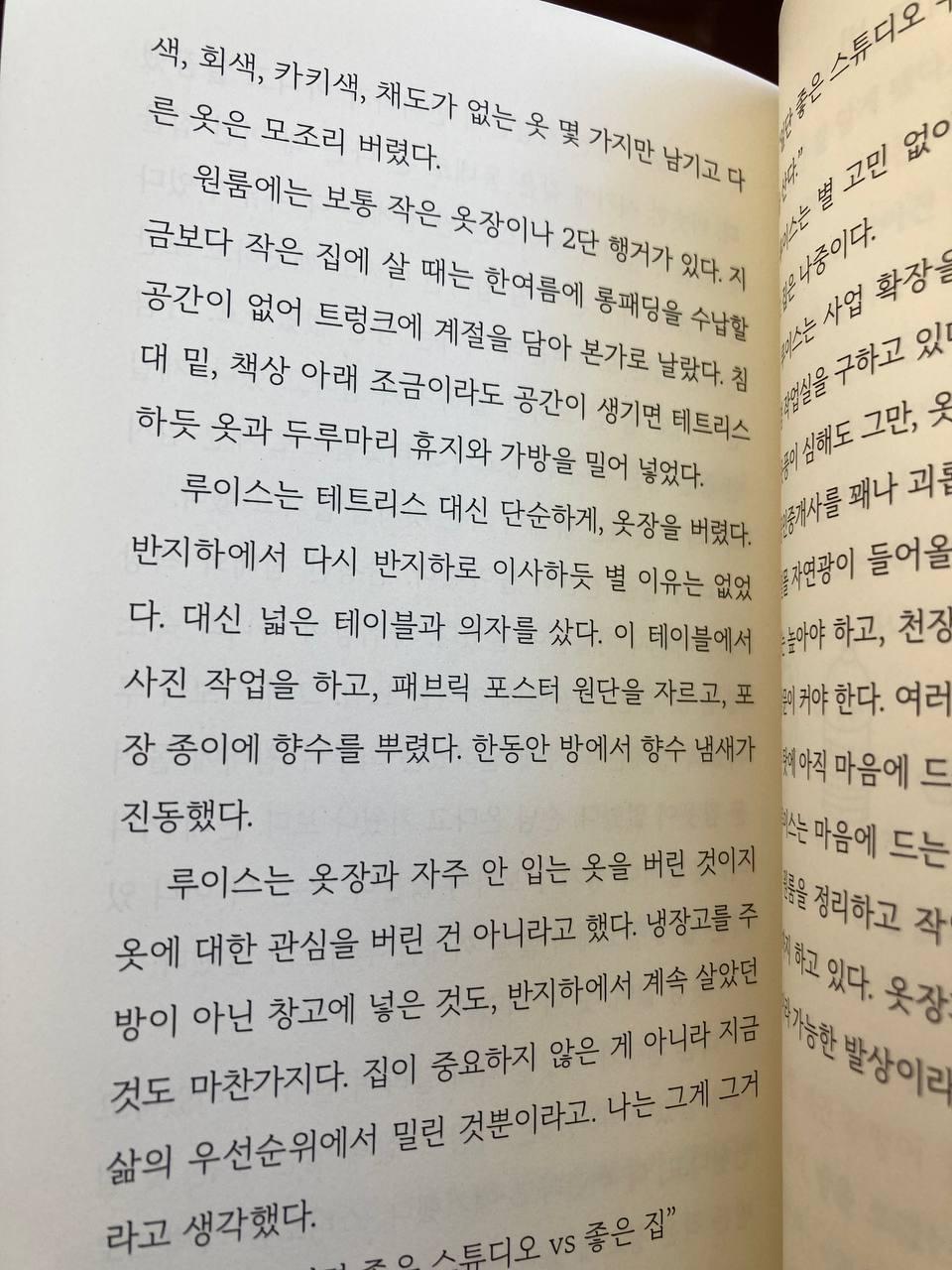 루이스는 옷장과 자주 안 입는 옷을 버린 것이지 옷에 대한 관심을 버린 건 아니라고 했다. 냉장고를 주방이 아닌 창고에 넣은 것도, 반지하에서 계속 살았던 것도 마찬가지다. 집이 중요하지 않은 게 아니라 지금 삶의 우선순위에서 밀린 것뿐이라고. 나는 그게 그거 라고 생각했다.