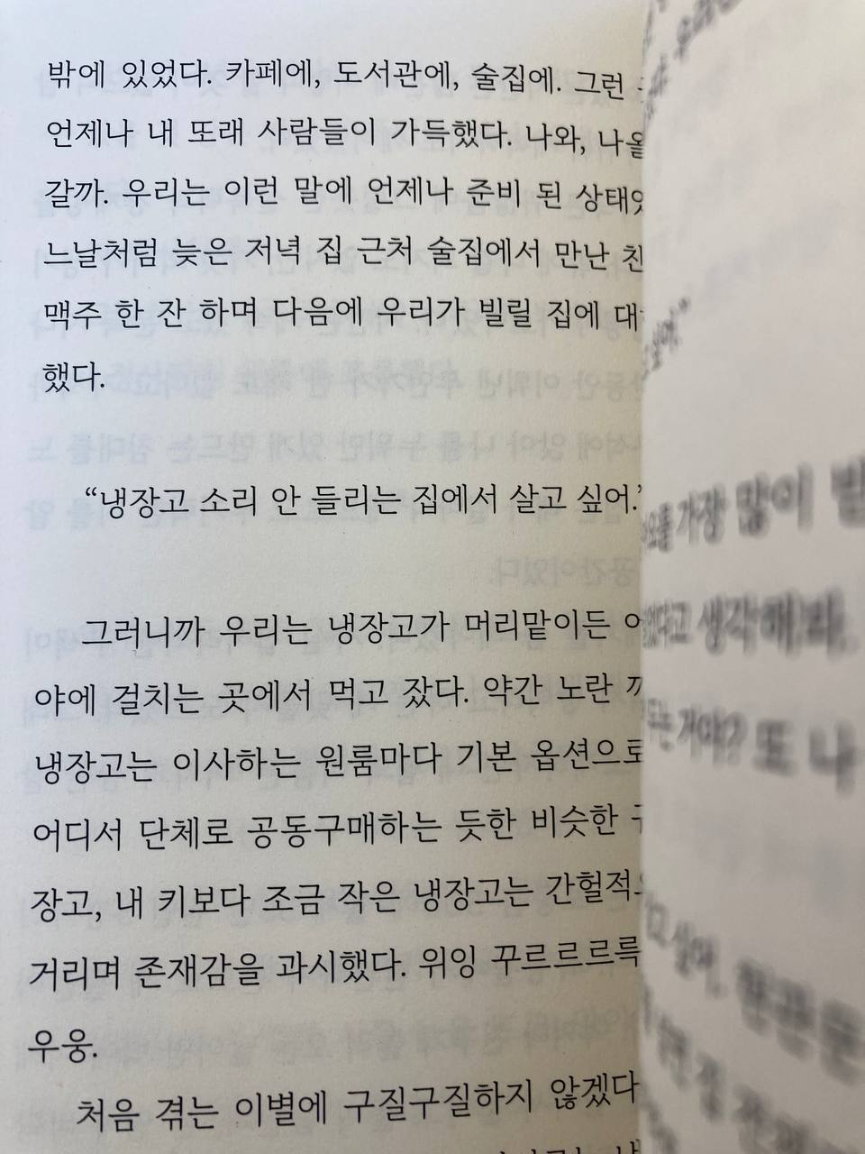 그러니까 우리는 냉장고가 머리맡이든 어디든 시야에 걸치는 곳에서 먹고 잤다. 약간 노란 끼가 도는 냉장고는 이사하는 원룸마다 기본 옵션으로 어디서 단체로 공동구매하는 듯한 비슷한 냉장고, 내 키보다 조금 작은 냉장고는 간헐적으로 윙윙거리며 존재감을 과시했다. 위잉 꾸르르르륵. 칵. 우우우웅.