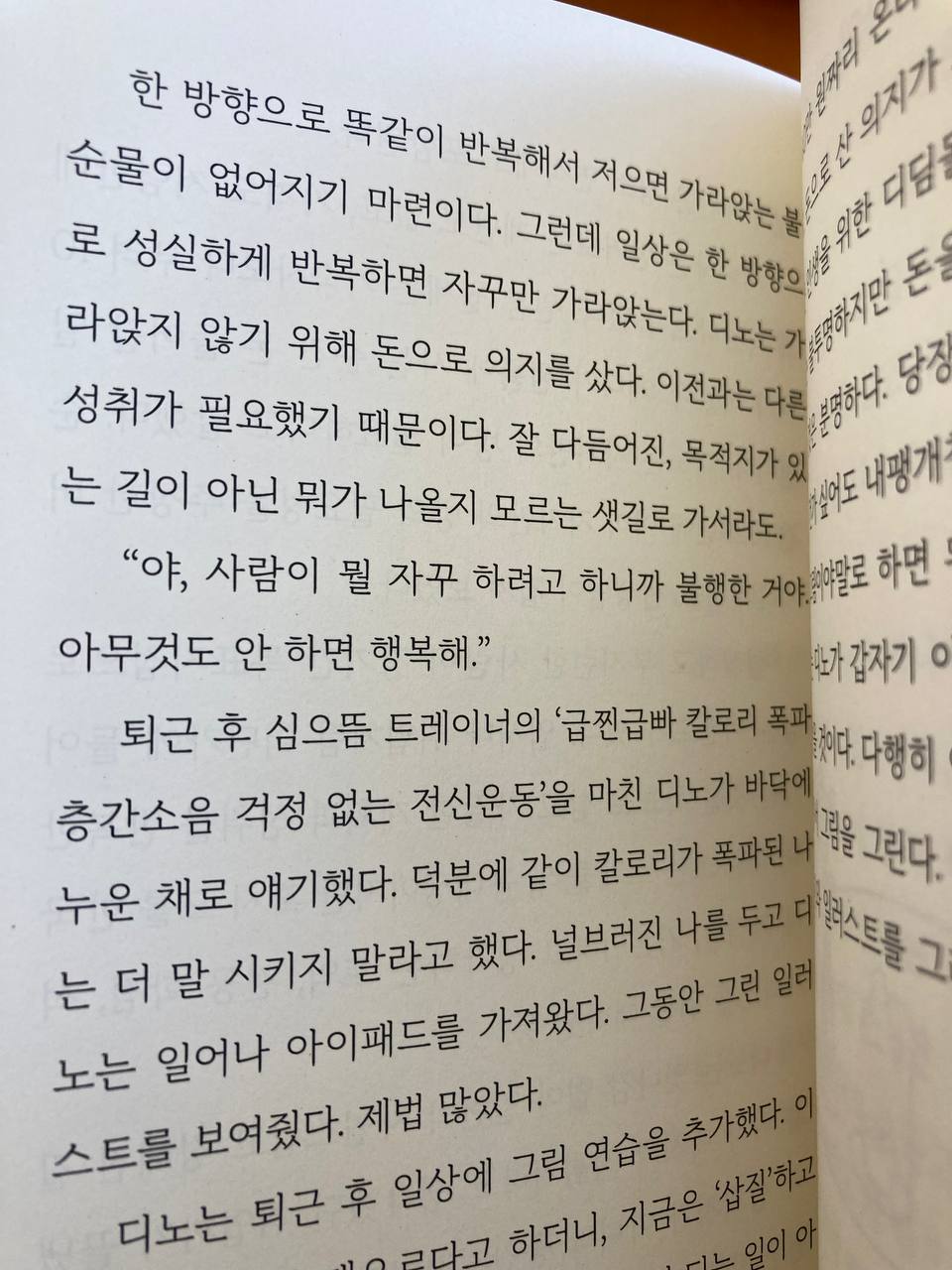 한 방향으로 똑같이 반복해서 저으면 가라앉는 불순물이 없어지기 마련이다. 그런데 일상은 한 방향으로 성실하게 반복하면 자꾸만 가라앉는다. 디노는 가라앉지 않기 위해 돈으로 의지를 샀다. 이전과는 다른 성취가 필요했기 때문이다. 잘 다듬어진, 목적지가 있 는 길이 아닌 뭐가 나올지 모르는 샛길로 가서라도.
