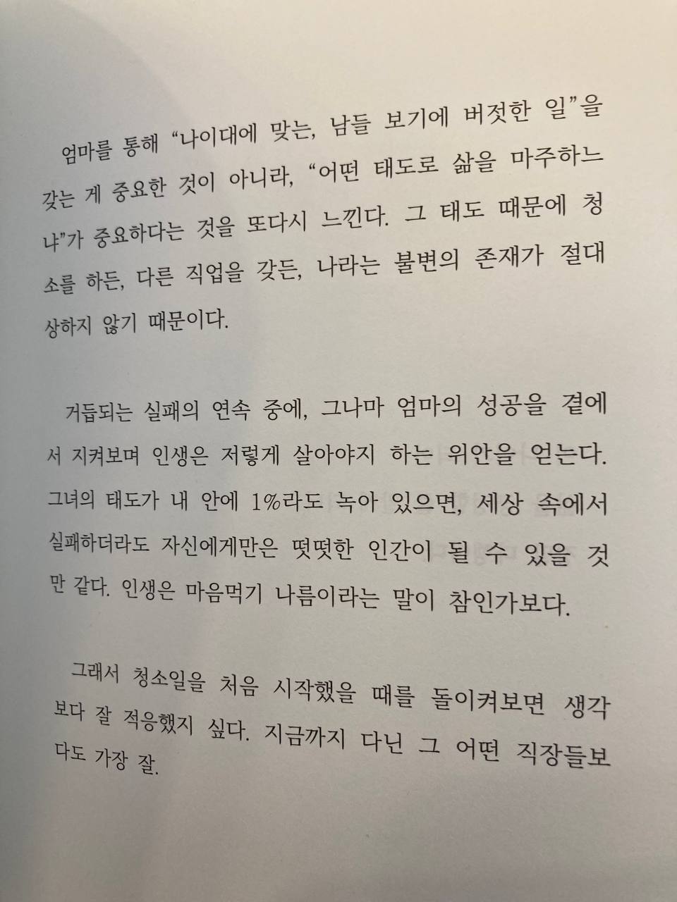 엄마를 통해 "나이대에 맞는, 남들 보기에 버젓한 일"을 갖는 게 중요한 것이 아니라, "어떤 태도로 삶을 마주하느냐"가 중요하다는 것을 또다시 느낀다. 그 태도 때문에 청소를 하든, 다른 직업을 갖든, 나라는 불변의 존재가 절대 상하지 않기 때문이다.