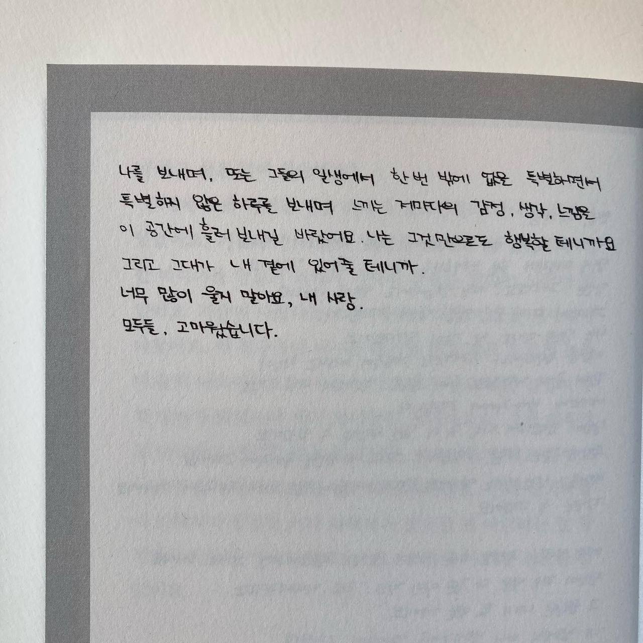 나를 보내며, 또 그들의 일생에서 한 번 밖에 없을 특별하면서 특별하지 않은 하루를 보내며 느끼는 저마다의 감정, 생각, 느낌을 이 공간에 흘러 보내길 바랐어요. 나는 그것만으로도 행복할 테니까요. 그리고 그대가 내 곁에 있어줄 테니까. 너무 많이 울지 말아요, 내 사랑. 모두들, 고마웠습니다.