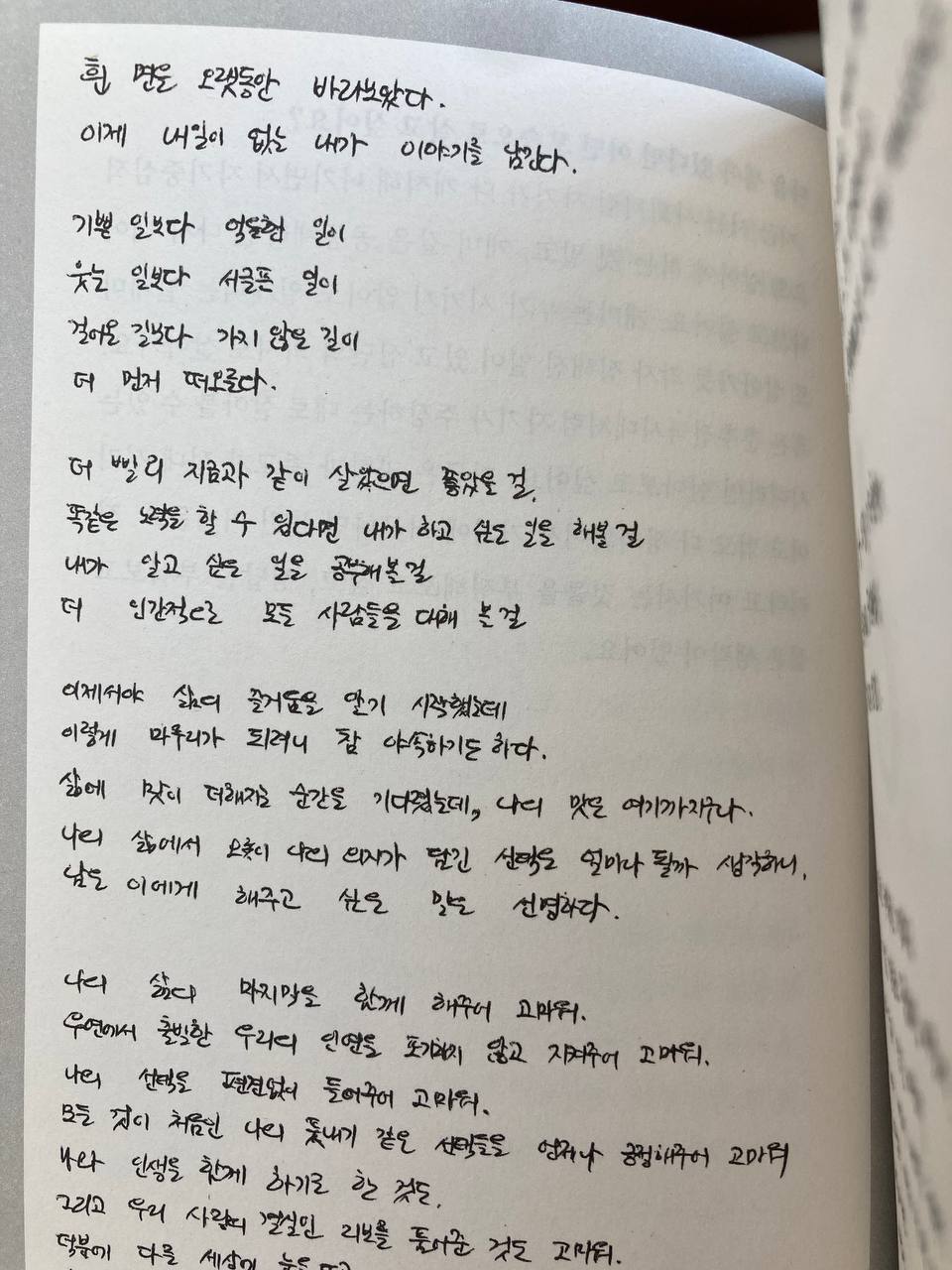 제가 진짜 많이 했던 말 중에 하나가 나는 지금 죽어도 크게 이상할 게 없다는 말이더라고요. '죽는 게 무서울 거다, 두려울 거다' 같은 말을 안 하고 살았거든요.