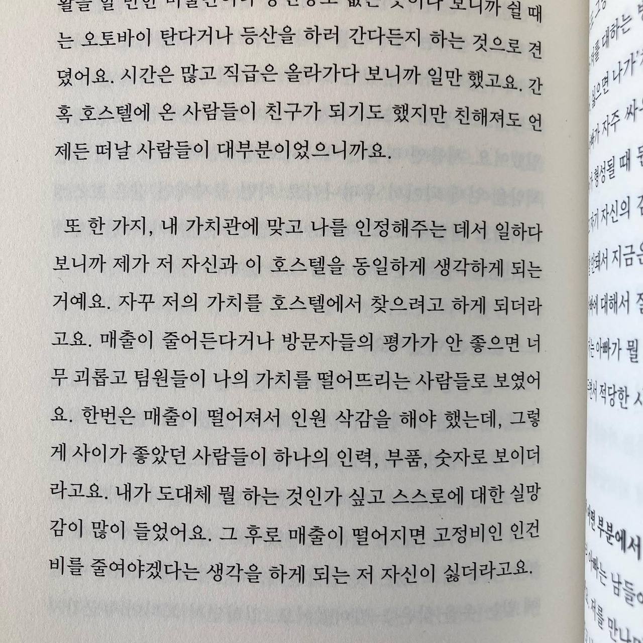 또 한 가지, 내 가치관에 맞고 나를 인정해주는 데서 일하다보니까 제가 저 자신과 이 호스텔을 동일하게 생각하게 되는 거예요. 자꾸 저의 가치를 호스텔에서 찾으려고 하게 되더라고요. 매출이 줄어든다거나 방문자들의 평가가 안 좋으면 너무 괴롭고 팀원들이 나의 가치를 떨어뜨리는 사람들로 보였어요. 한번은 매출이 떨어져서 인원 삭감을 해야 했는데, 그렇게 사이가 좋았떤 사람들이 하나의 인력, 부품, 숫자로 보이더라고요. 내가 도대체 뭘 하느 ㄴ것인가 싶고 스스로에 대한 실망감이 많이 들었어요. 그 후로 매출이 떨어지면 고정비인 인건비를 줄여야겠다는 생각을 하게 되는 저 자신이 싫더라고요.