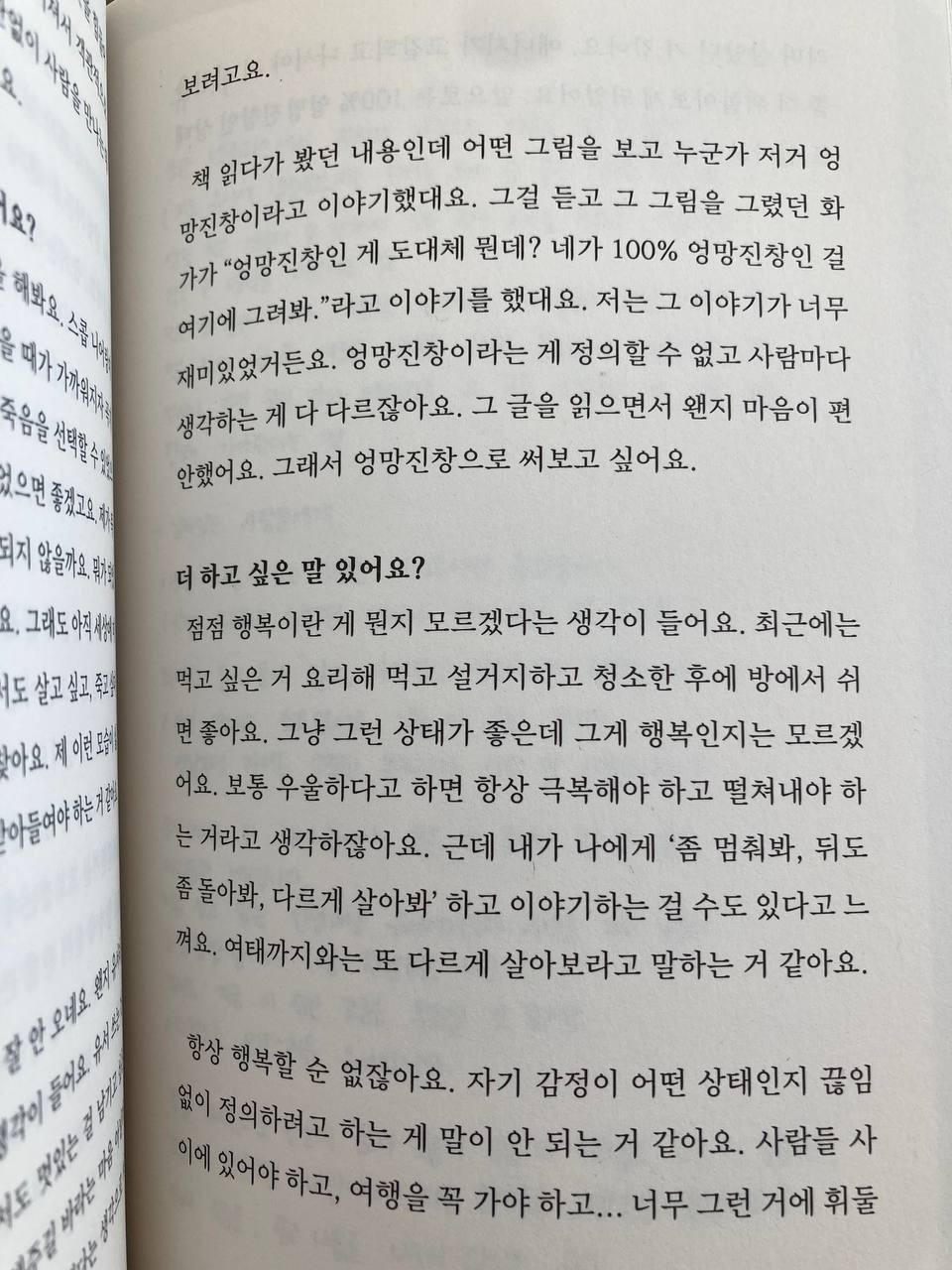 항상 행복할 순 없잖아요. 자기 감정이 어떤 상태인지 끊임없이 정의하려고 하는 게 말이 안 되는 거 같아요. 사람들 사이에 있어야 하고, 여행을 꼭 가야 하고... 너무 그런 거에...