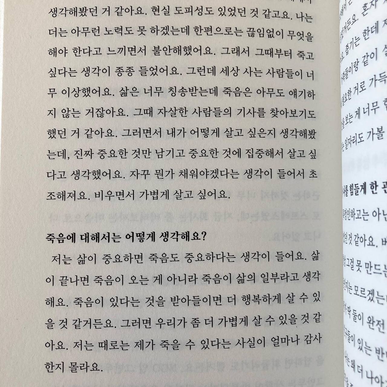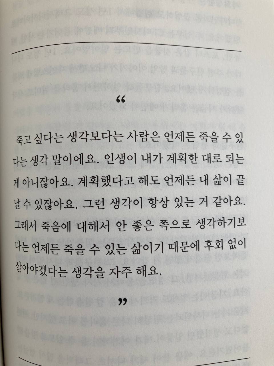 죽고 싶다는 생각보다는 사람은 언제든 죽을 수 있 다는 생각 말이에요. 인생이 내가 계획한 대로 되는 게 아니잖아요. 계획했다고 해도 언제든 내 삶이 끝 날 수 있잖아요. 그런 생각이 항상 있는 거 같아요. 그래서 죽음에 대해서 안 좋은 쪽으로 생각하기보다는 언제든 죽을 수 있는 삶이기 때문에 후회 없이 살아야겠다는 생각을 자주 해요.
