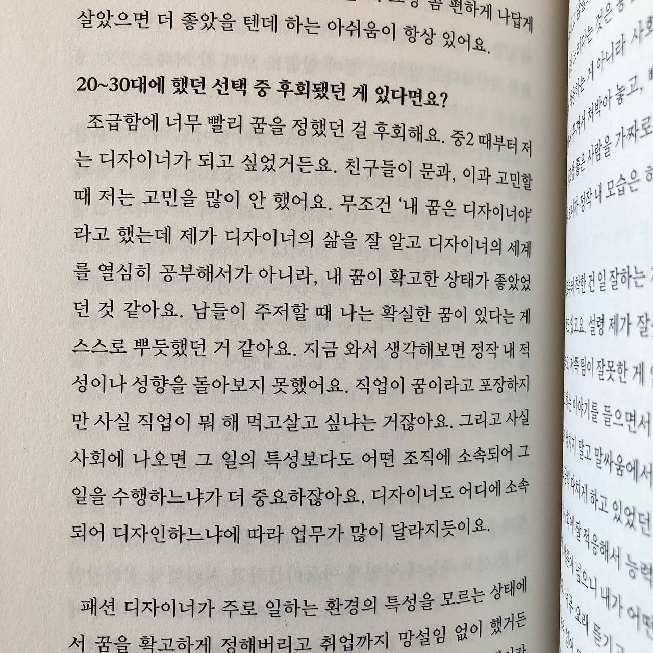 조급함에 너무 빨리 꿈을 정했던 걸 후회해요. 중2 때부터 저는 디자이너가 되고 싶었거든요. 친구들이 문과, 이과 고민할 때 저는 고민을 많이 안 했어요. 무조건 '내 꿈은 디자이너야'라고 했는데 제가 디자이너의 삶을 잘 알고 디자이너의 세계를 열심히 공부해서가 아니라, 내 꿈이 확고한 상태가 좋았었던 것 같아요. 남들이 주저할 때 나는 확실한 꿈이 있다는 게 스스로 뿌듯했던 거 같아요. 지금 와서 생각해보면 정작 내 적성이나 성향을 돌아보지 못했어요. 직업이 꿈이라고 포장하지만 사실 직업이 뭐 해 먹고살고 싶냐는 거잖아요. 그리고 사실 사회에 나오면 그 일의 특성보다도 어떤 조직에 소속되어 그 일을 수행하느냐가 더 중요하잖아요. 디자이너도 어디에 소속되어 디자인하느냐에 따라 업무가 많이 달라지듯이요.