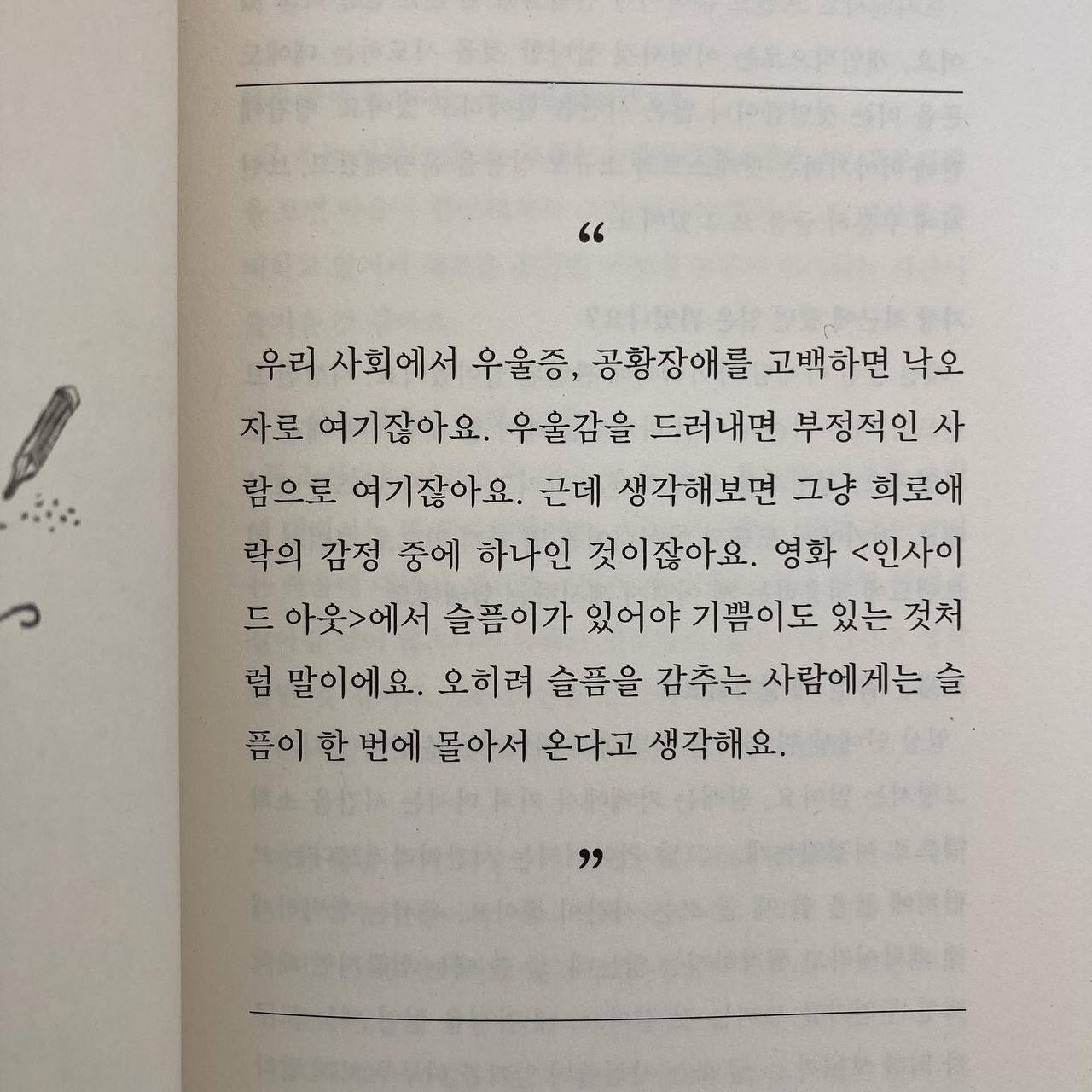 "우리 사회에서 우울증, 공황장애를 고백하면 낙오자로 여기잖아요. 우울감을 드러내면 부정적인 사람으로 여기잖아요. 근데 생각해보면 그냥 희로애락의 감정 중에 하나인 것이잖아요. 영화 <인사이드 아웃>에서 슬픔이가 있어야 기쁨이도 있는 것처럼 말이에요. 오히려 슬픔을 감추는 사람에게는 슬픔이 한 번에 몰아서 온다고 생각해요."