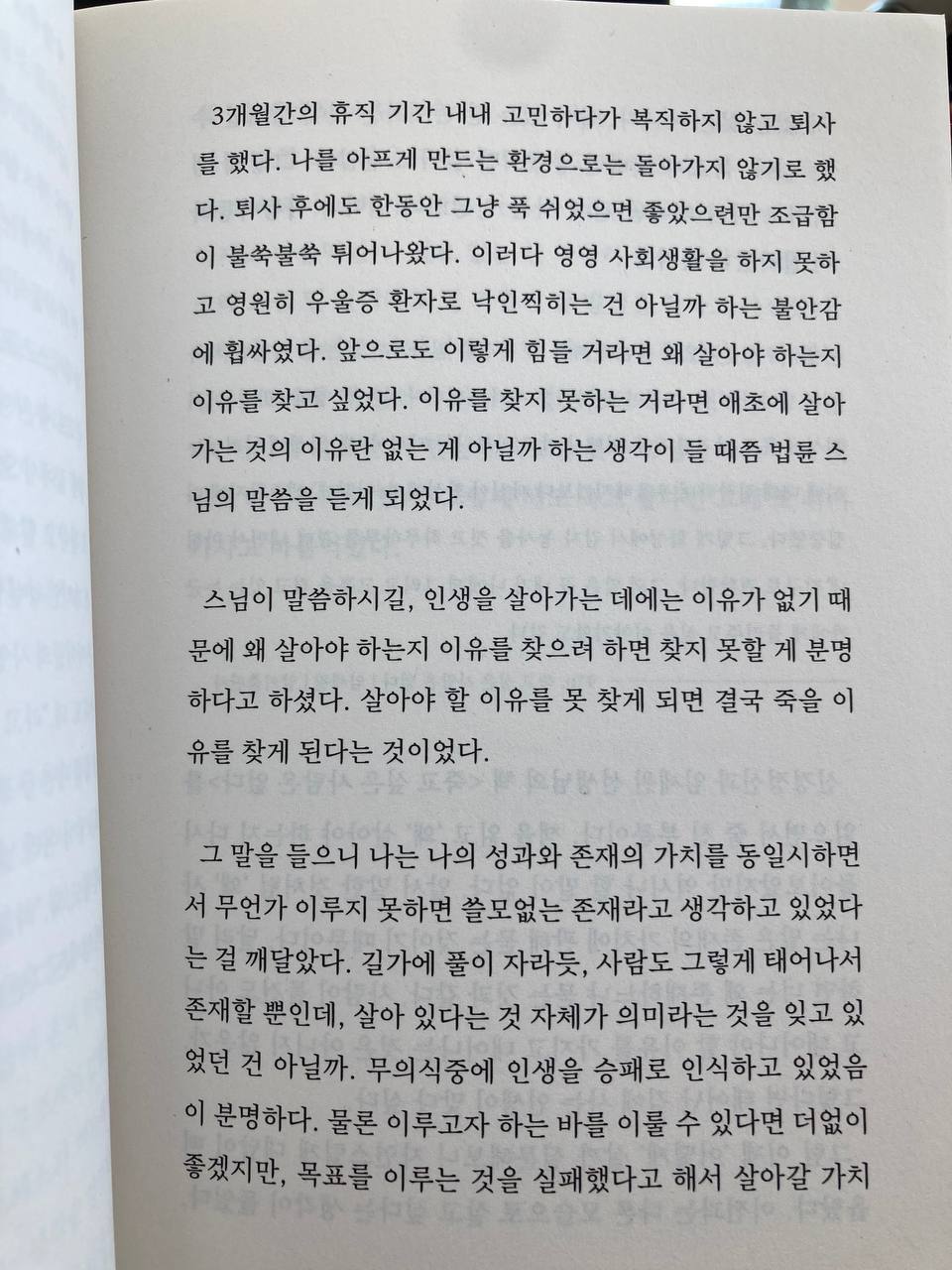 스님이 말씀하시길, 인생을 살아가는 데에는 이유가 없기 때문에 왜 살아야 하는지 이유를 찾으려 하면 찾지 못할 게 분명하다고 하셨다. 살아야 할 이유를 못 찾게 되면 결국 죽을 이유를 찾게 된다는 것이었다.