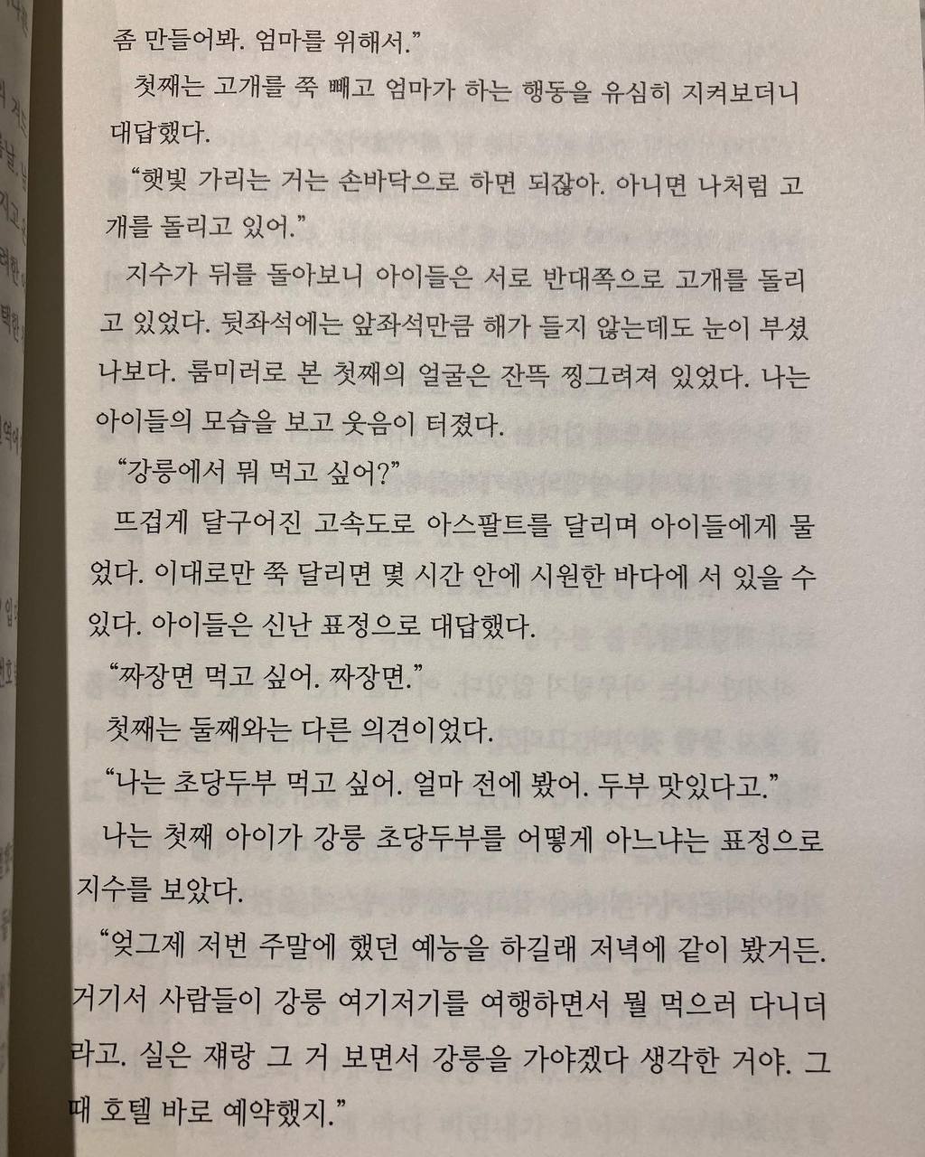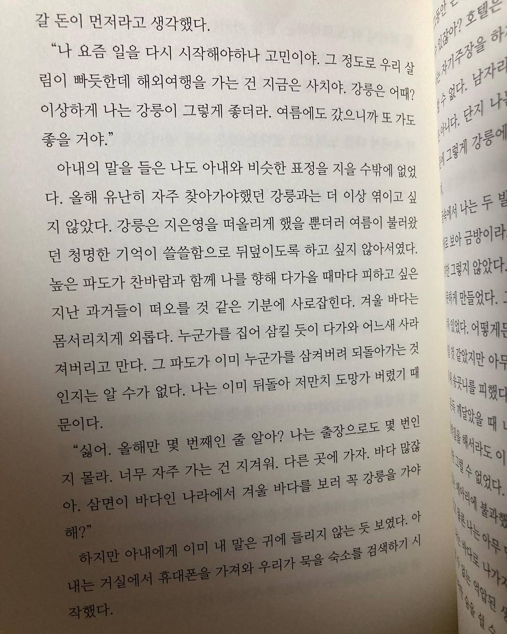 “나 요즘 일을 다시 시작해야하나 고민이야. 그 정도로 우리 살림이 빠듯한데 해외여행을 가는 건 지금은 사치야. 강릉은 어때? 이상하게 나는 강릉이 그렇게 좋더라. 여름에도 갔으니까 또 가도 좋을 거야.”