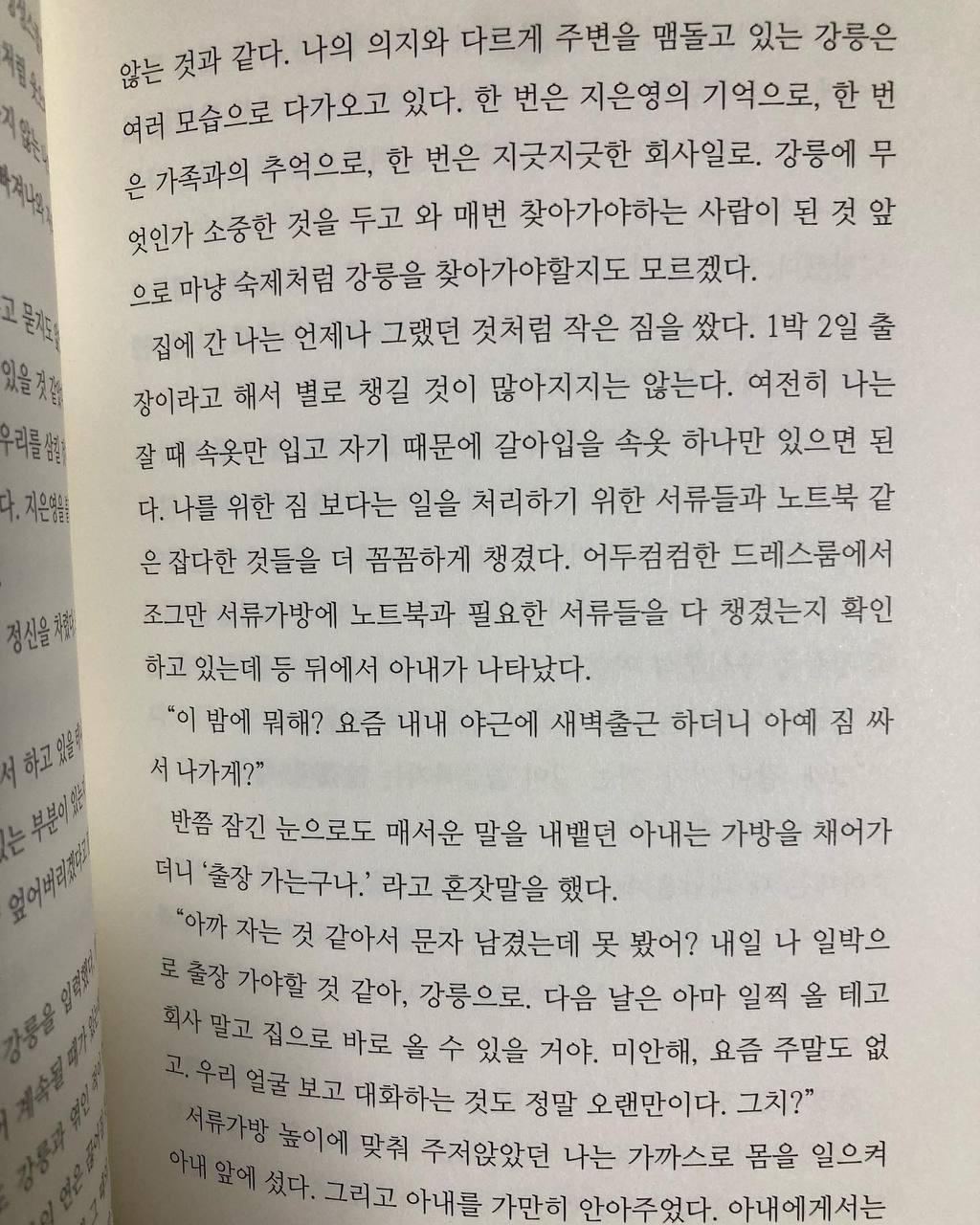 반쯤 잠긴 눈으로도 매서운 말을 내뱉던 아내는 가방을 채어가더니 '출장 가는구나.’라고 혼잣말을 했다.