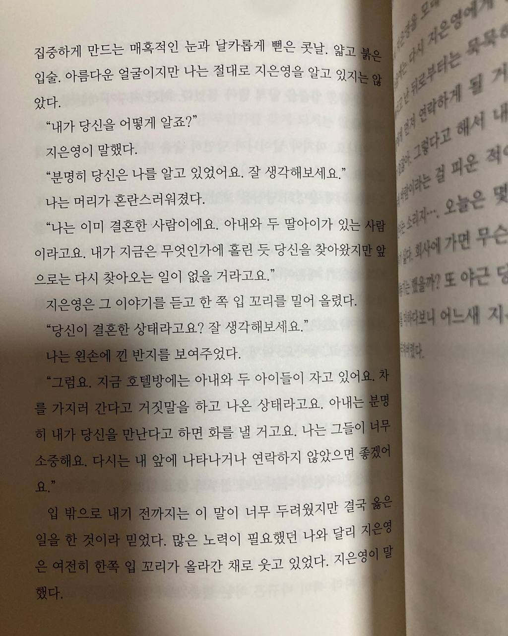 집중하게 만드는 매혹적인 눈과 날카롭게 뻗은 콧날. 얇고 입술. 아름다운 얼굴이지만 나는 절대로 지은영을 알고 있지는 않았다.
