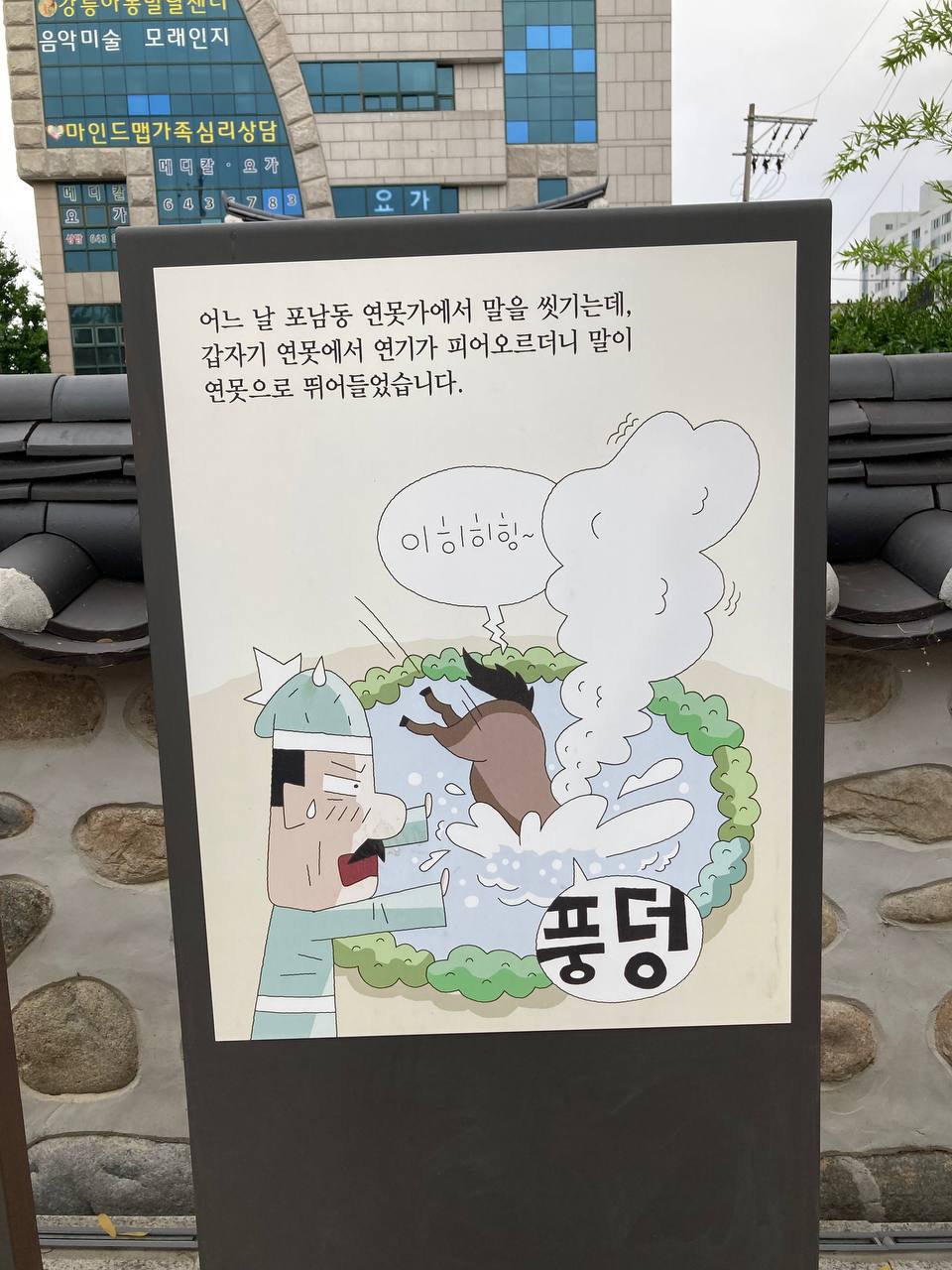 어느 날 포남동 연못가에서 말을 씩기는데, 갑자기 연못에서 연기가 피어오르더니 말이 연못으로 뛰어들었습니다.