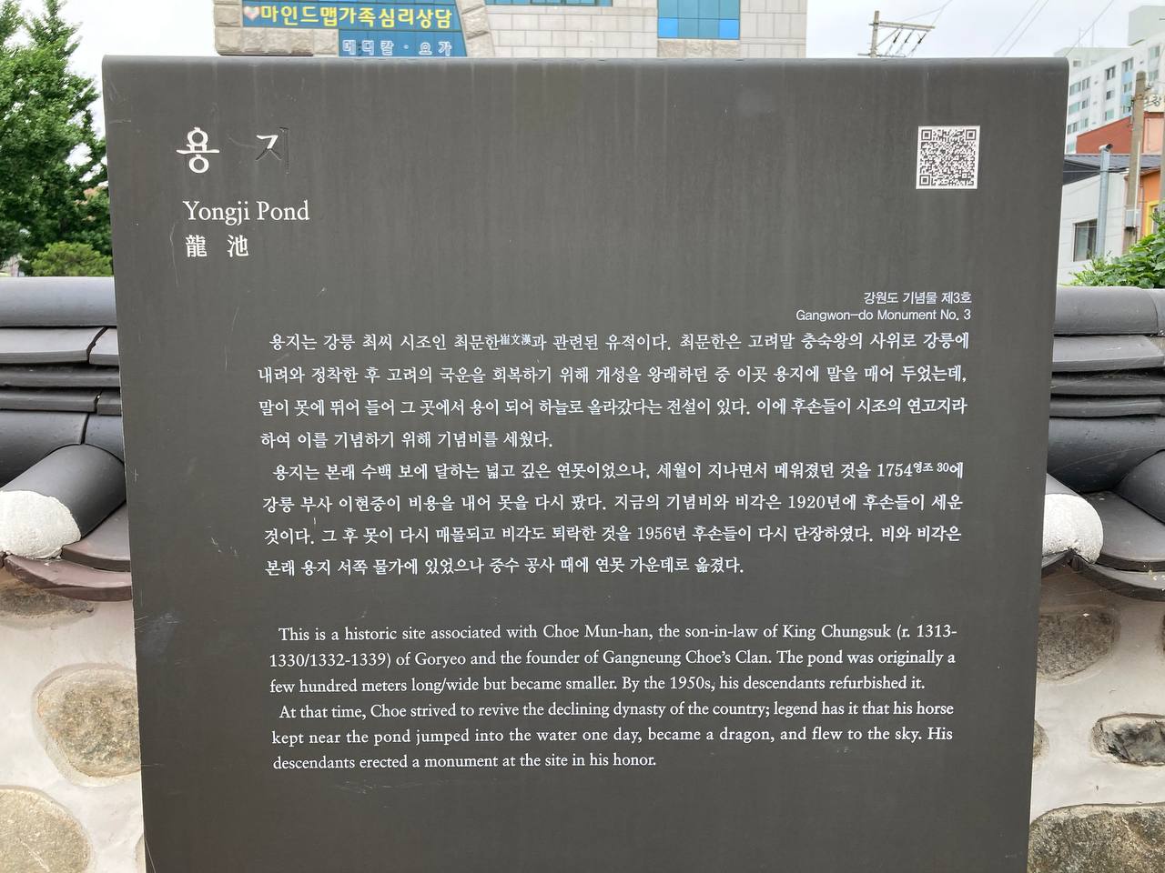 This is a historic site associated with Choe Mun-han, the son-in-law of King Chungsuk (r. 1313-1330/1332-1339) of Goryeo and the founder of Gangneung Choe's Clan. The pond was originally a few hundred meters long/wide but became smaller. By the 1950s, his descendants refurbished it.