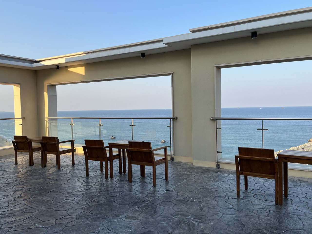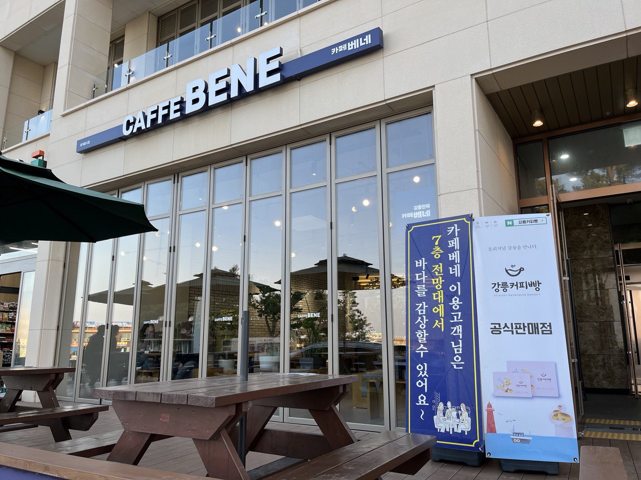 강릉 안목항, 커피거리에 있는 프렌차이즈 카페. 카페베네는 한 때 스타벅스의 자리를 넘 볼 정도 확장세가 대단했으나 어느 순간 우리 주변에서 사라졌다가 요즘 다시 보이기 시작한 브랜드다. 그래서일까 이곳은 공간 대비 사람이 적어 평일에 방문하면 여유롭게 바다를 보며 시간을 보낼 수 있다. 특히 카페 이용객은 펜션에서 운영하는 7층 전망대도 이용할 수 있는데 전망이 참 좋다.