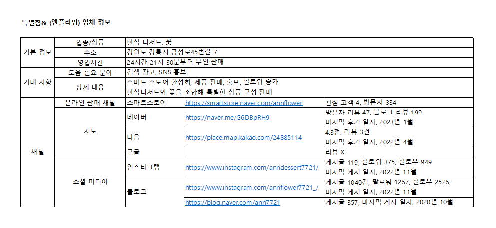 강다방은 최근 강원창조경제혁신센터에서 운영하는 <강원 온라인 마케터 양성사업>을 듣고 있다. 3-4기 때는 마케터의 실습 대상 소상공인 업체로 참여했었고, 5기 때는 마케터로 참여하여 직접 소상공인의 홍보를 돕고 네이버 스마트스토어도 운영할 예정이다. 강다방과 매칭된 업체는 강릉 중앙시장에 있는 꽃집 앤플라워(특별함&)로 소상공인 업체와 첫 미팅 전 업체 조사와 질문지를 정리해봤다.