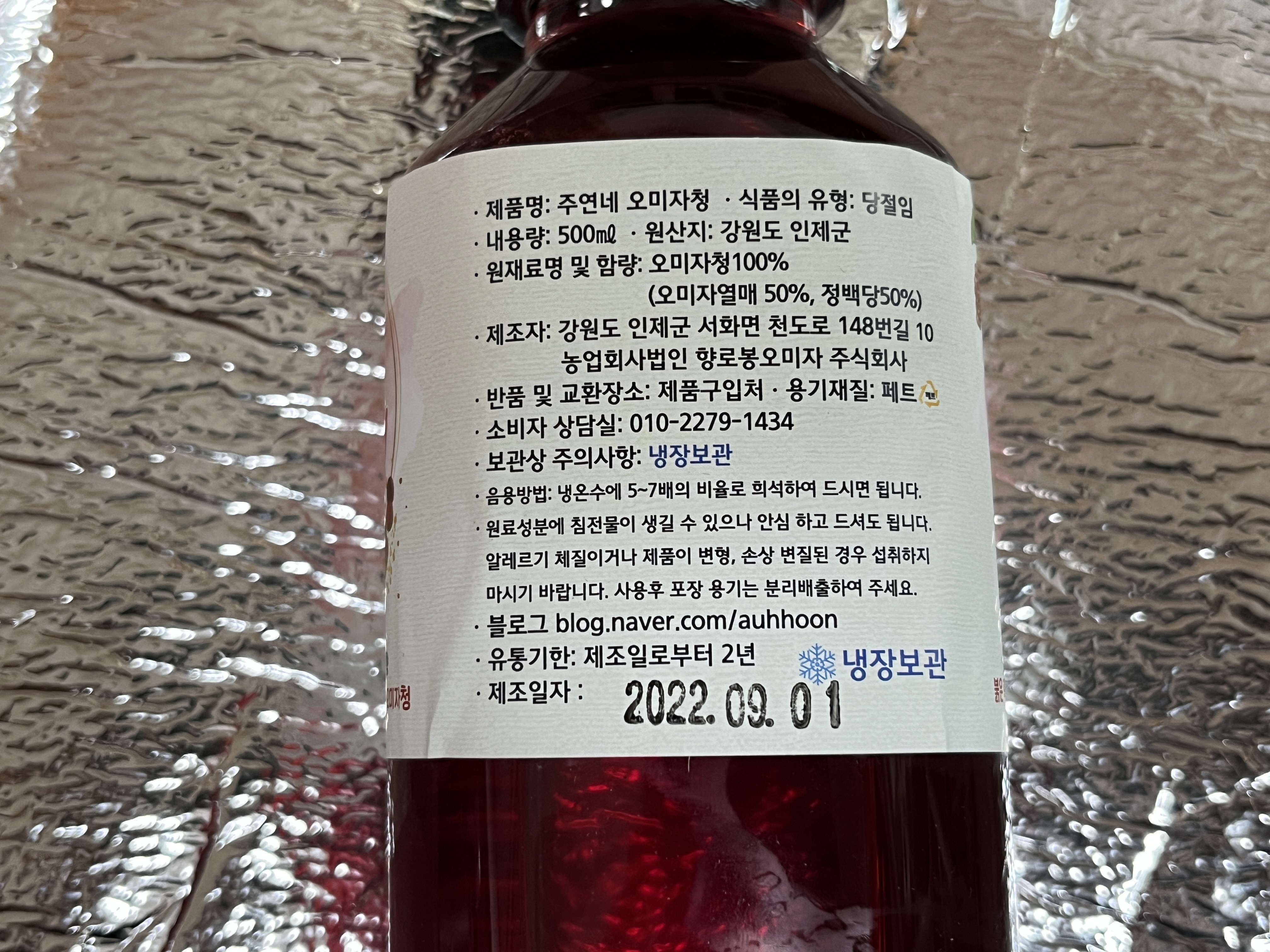 · 원재료명 및 함량 : 오미자청 100% (오미자열매 50%, 정백당 50%)