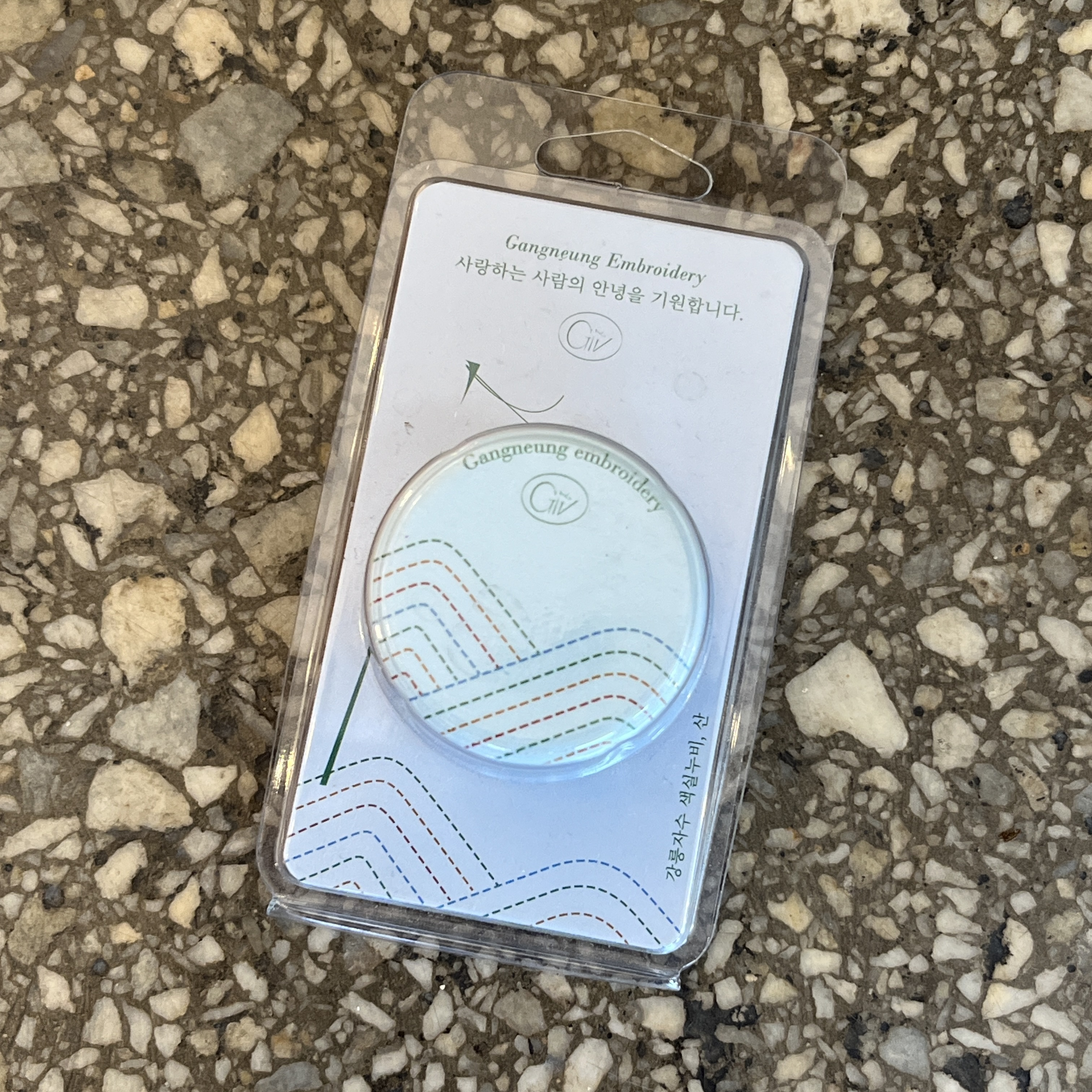 강릉 자수 문양을 사용하여 만든 그립톡. 휴대폰 뒷면에 붙이면 강릉을 매일 기억할 수 잇다. 강릉 자수는 19세기 강릉 여인들에 의해 수놓아졌던 강릉의 문양이다. 조선 시대 자수는 보통 풍경이나 자연물을 사실적으로 표현하는 자수가 대부분인데, 강릉 자수는 추상적이고 독특한 패턴이 특징이다. 강릉 자수 문양에는 행운과 번영, 장수, 안녕을 바라는 뜻이 담겨있다.
