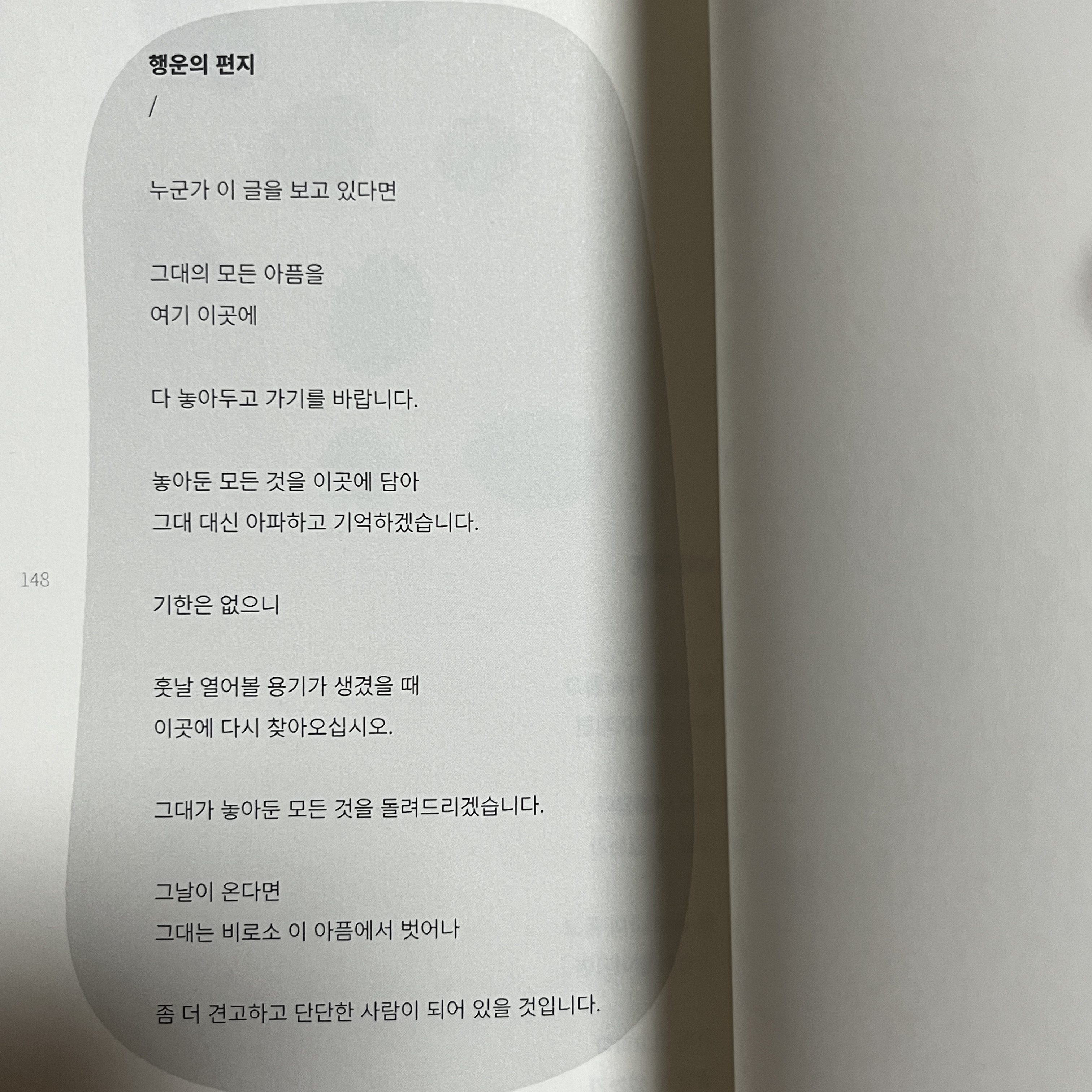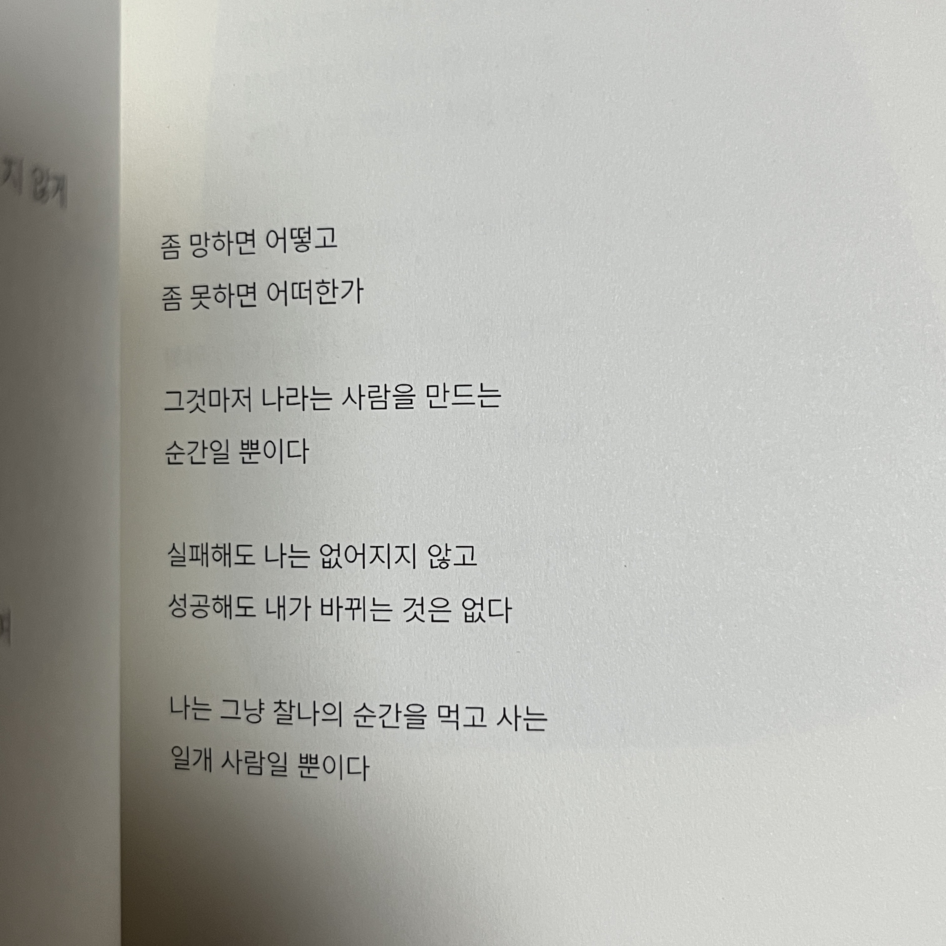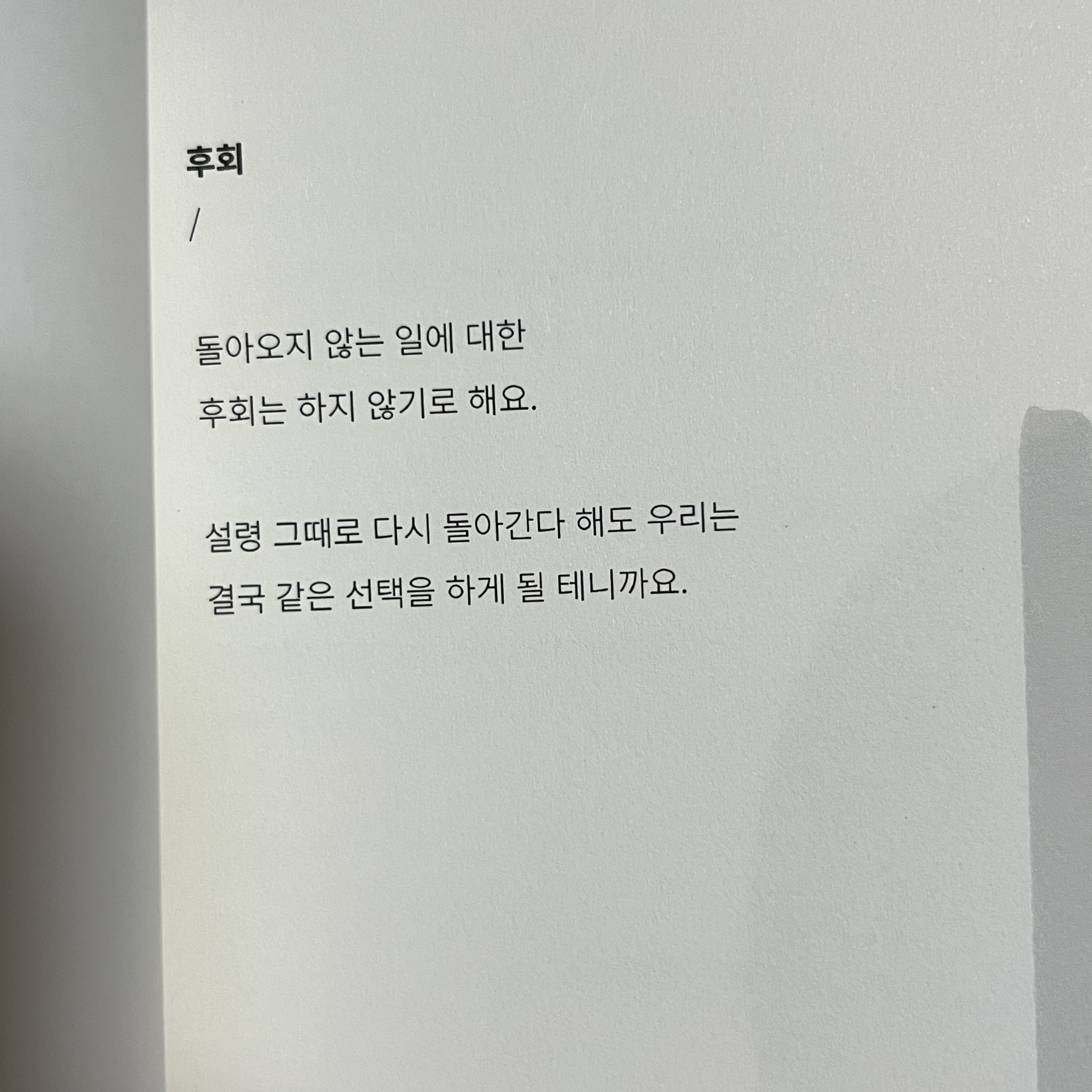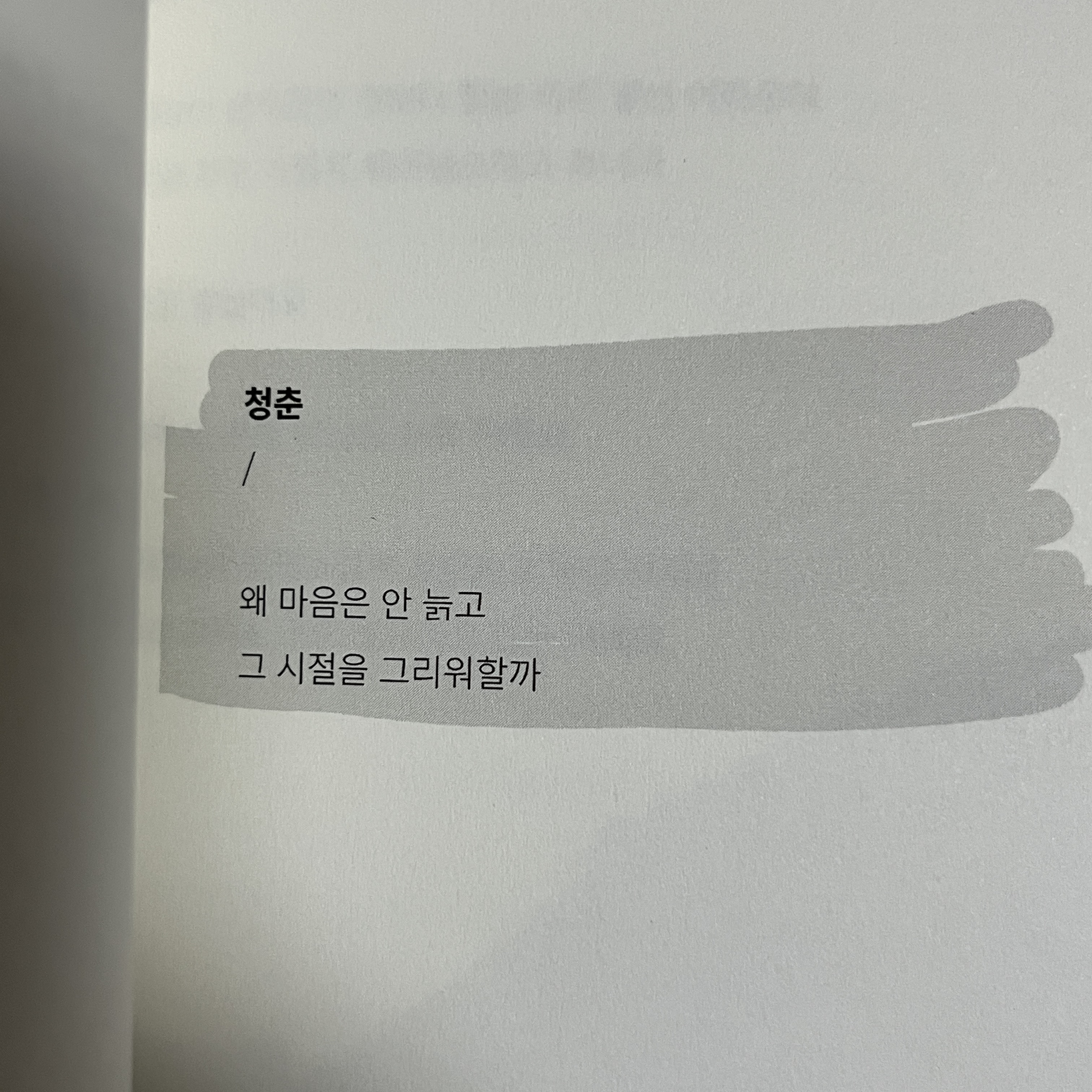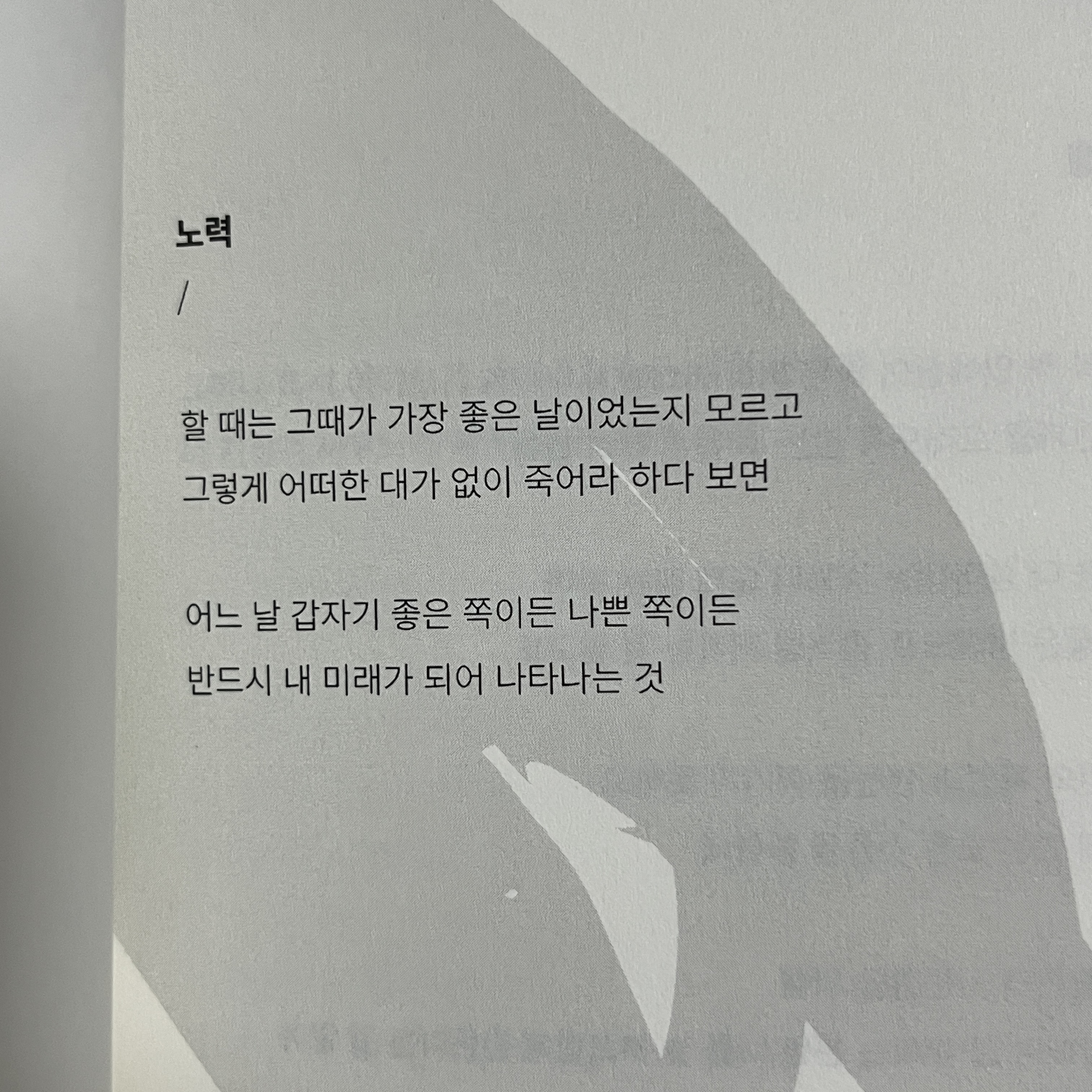 클래식 타악기 연주자가 되기 위해 유학길에 올라 현재는 독일에 거주하는, 연주자이자 엄마, 아내, 며느리, 누군가에게는 친구, 선생님인 작가가 쓴 글 모음. 이 책을 읽고 나면 왠지 모르게 용기가 난다. 다른 독립출판물에 비해 두껍게 느껴질 수 있지만, 여백이 많아 부담 없이 읽을 수 있고 더 나아가 여백에 무언가 적고 싶어지는 책이다.