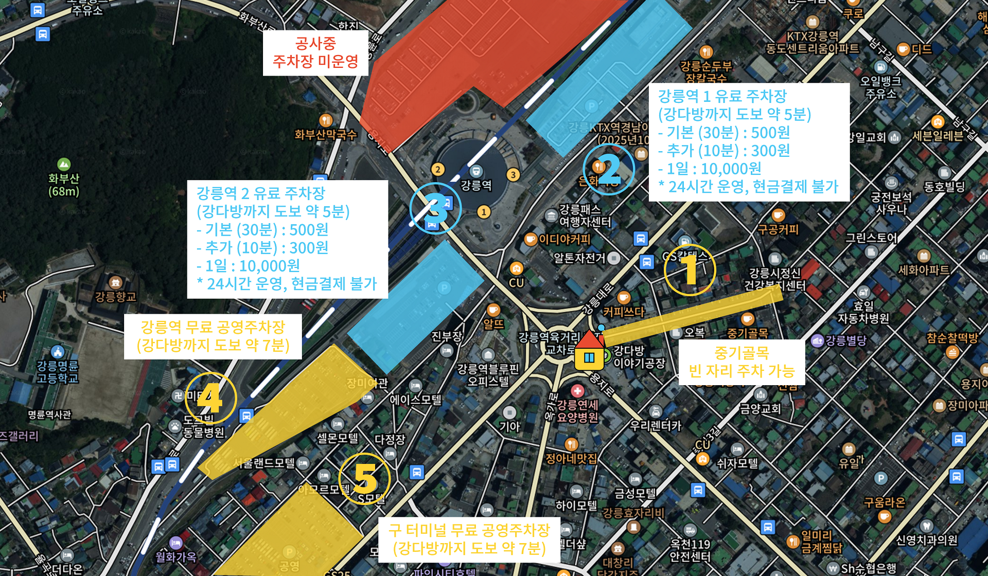 2. 강릉역 1 유료 주차장 (강다방까지 도보 약 5분)