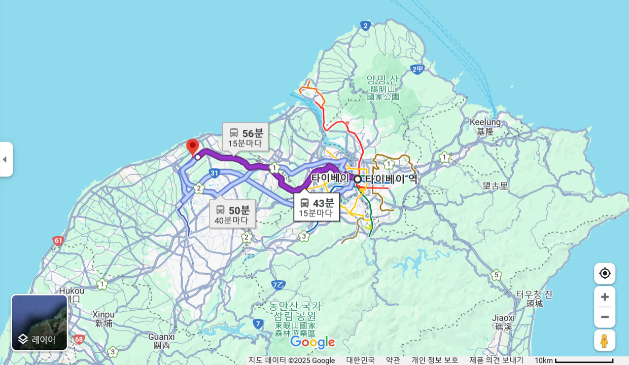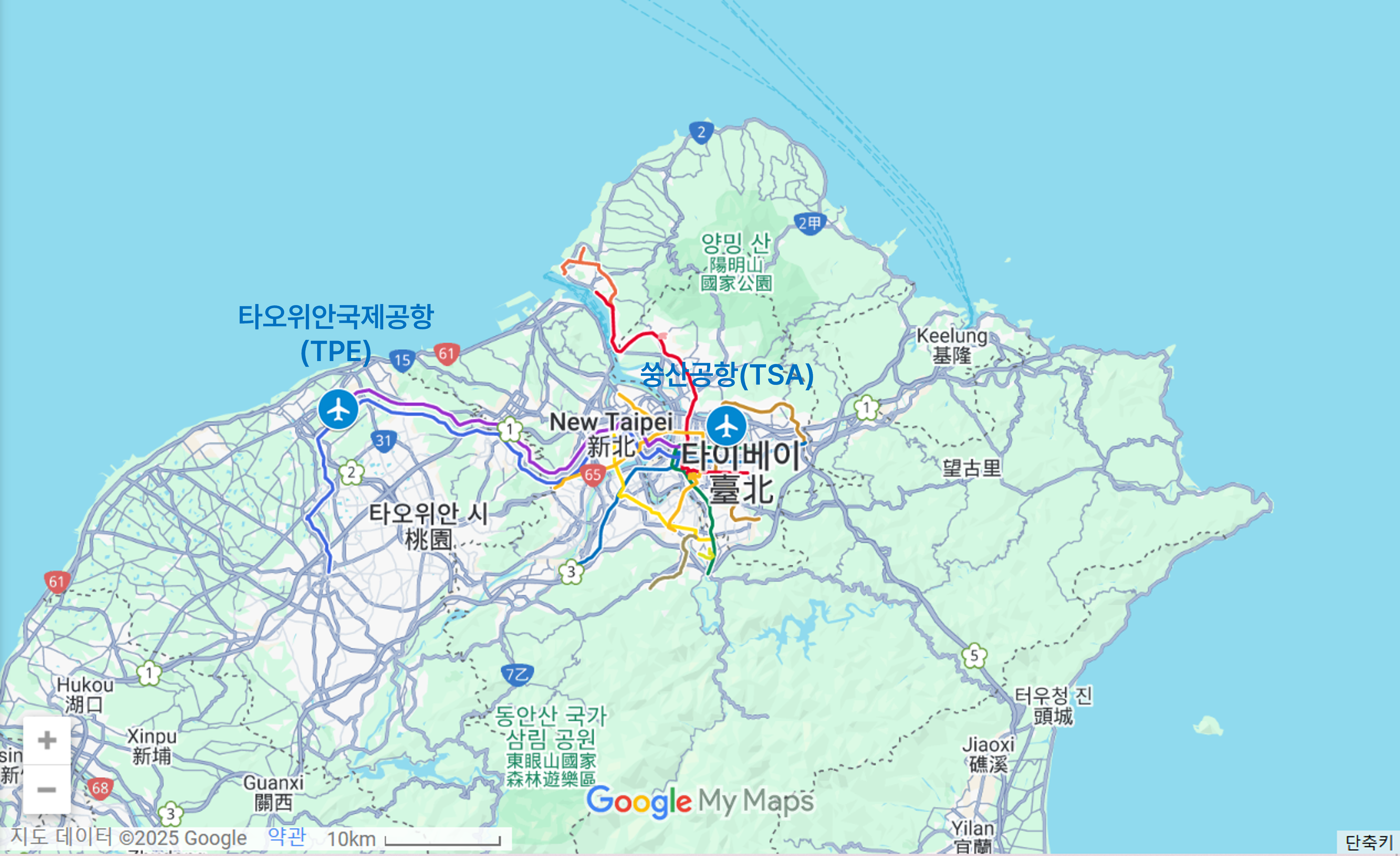 타이베이 시내 타이베이역에서 숭산공항 가는 법과 소요시간. 같은 축척(10km) 지도로 봤을 때, 서울에서 인천공항가는 거리와 비슷하다.