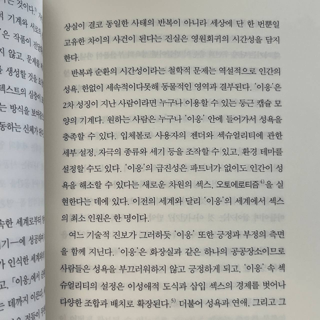 반복과 순환의 시간성이라는 철학적 문제는 역설적으로 인간의 성욕, 한없이 세속적이다못해 동물적인 영역과 결부된다. '이응'은 2차 성징이 지난 사람이라면 누구나 이용할 수 있는 둥근 캡슐 모양의 기계다. 원하는 사람은 누구나 '이응' 안에 들어가서 성욕을 충족할 수 있다. 입체볼로 사용자의 젠더와 섹슈얼리티에 관한 세부 설정, 자극의 종류와 세기 등을 조작할 수 있고, 환경 테마를 설정할 수도 있다. '이응'의 급진성은 파트너가 없이도 인간이 성욕을 해소할 수 있다는 새로운 차원의 섹스, 오토에로티즘을 실현한다는 데에 있다. 이전의 세계와 달리 '이응'의 세계에서 섹스의 최소 인원은 한 명이다.