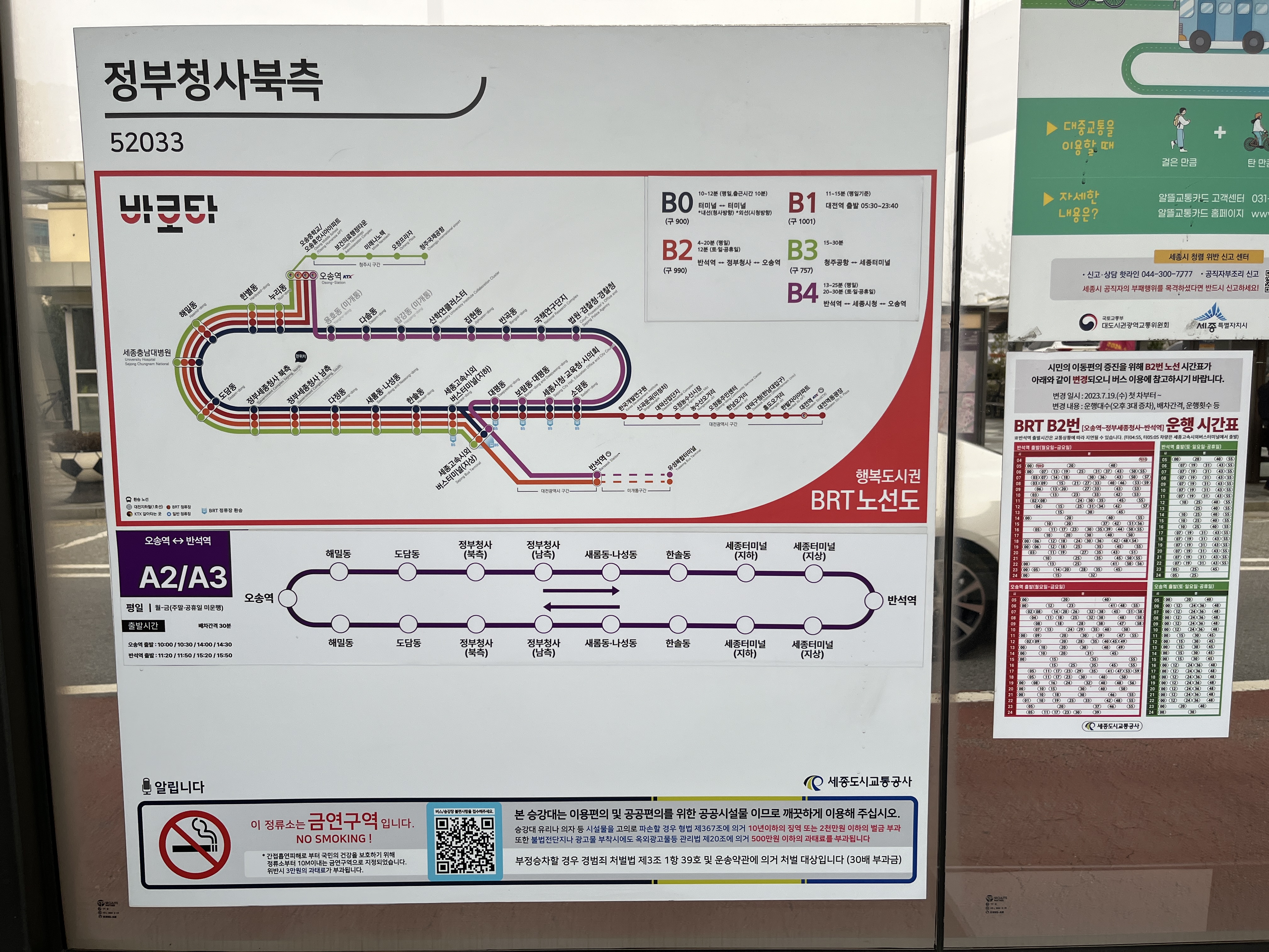 오송역에서 7번 출구로 내려가면 버스 정류장이 있다. 이 곳에서 정부세종청사로 가는 버스(B1, B2, B3, B4) 중 먼저 오는 것을 타고 정부세종청사로 가면 된다. 오송역에는 정부세종청사로 갈 것 같은(?) 사람들이 많이 보이니 그들을 따라가면 어렵지 않다. 오송역에서 B1, B2, B3, B4 중 뭘 타야하는지 고민했는데, 오송역에서 정부세종청사, 세종고속시외버스터미널까지는 노선이 같으니 아무 버스나 타도 된다. 아래는 세종시 B1, B1, B2, B3, B4 버스 노선도.