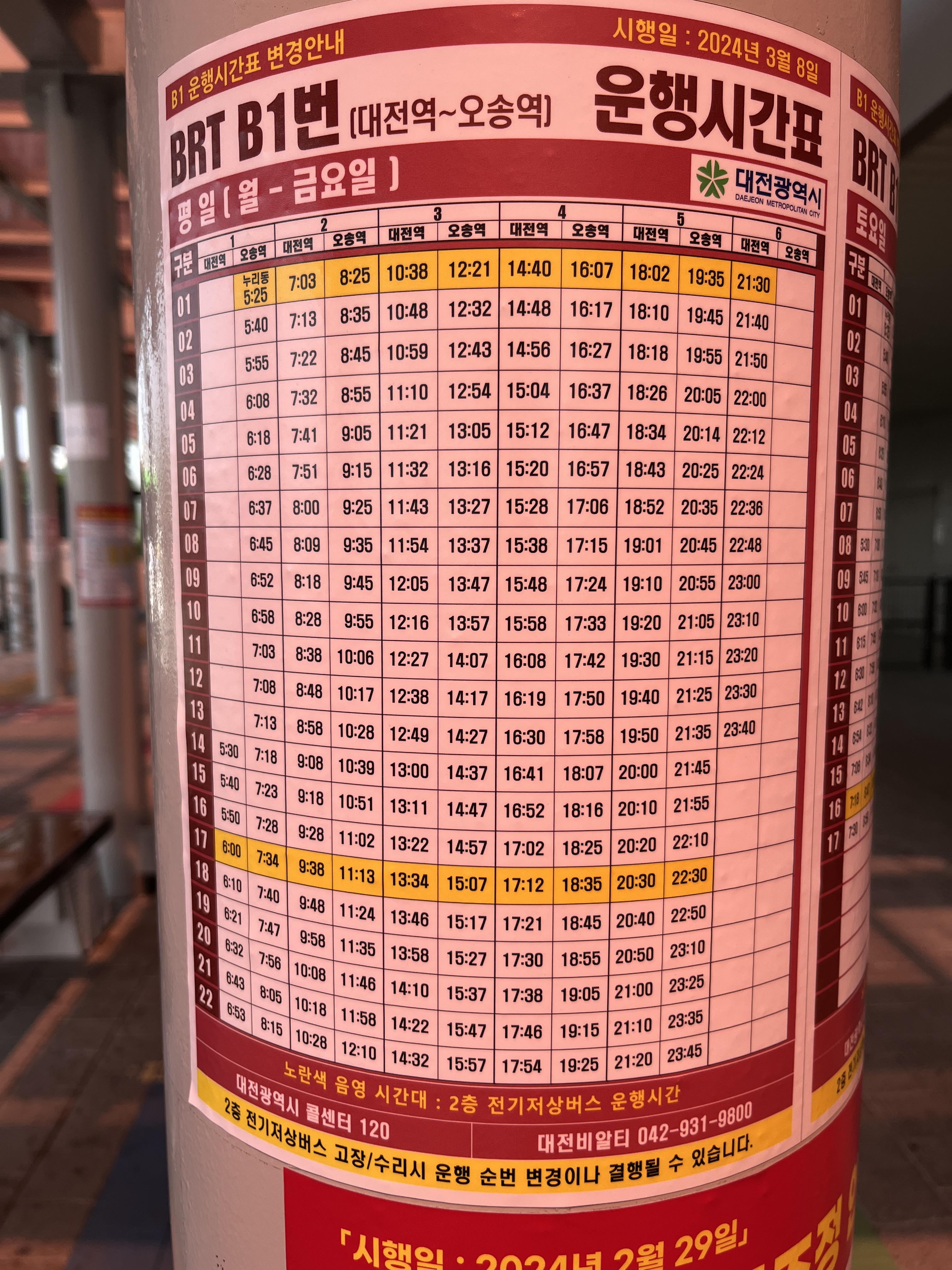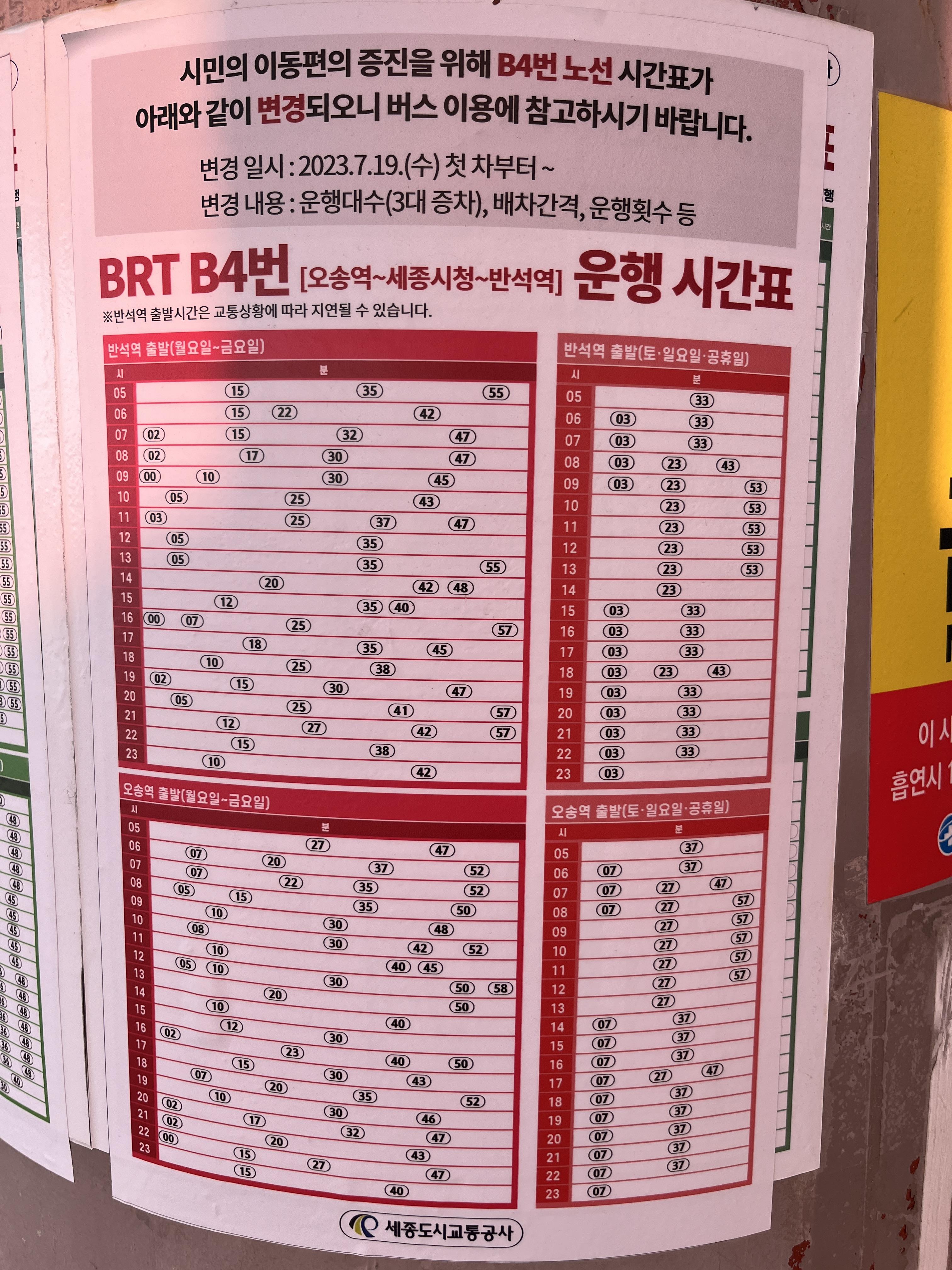 BRT B4번 (오송역~세종시청~반석역) 운행시간표
