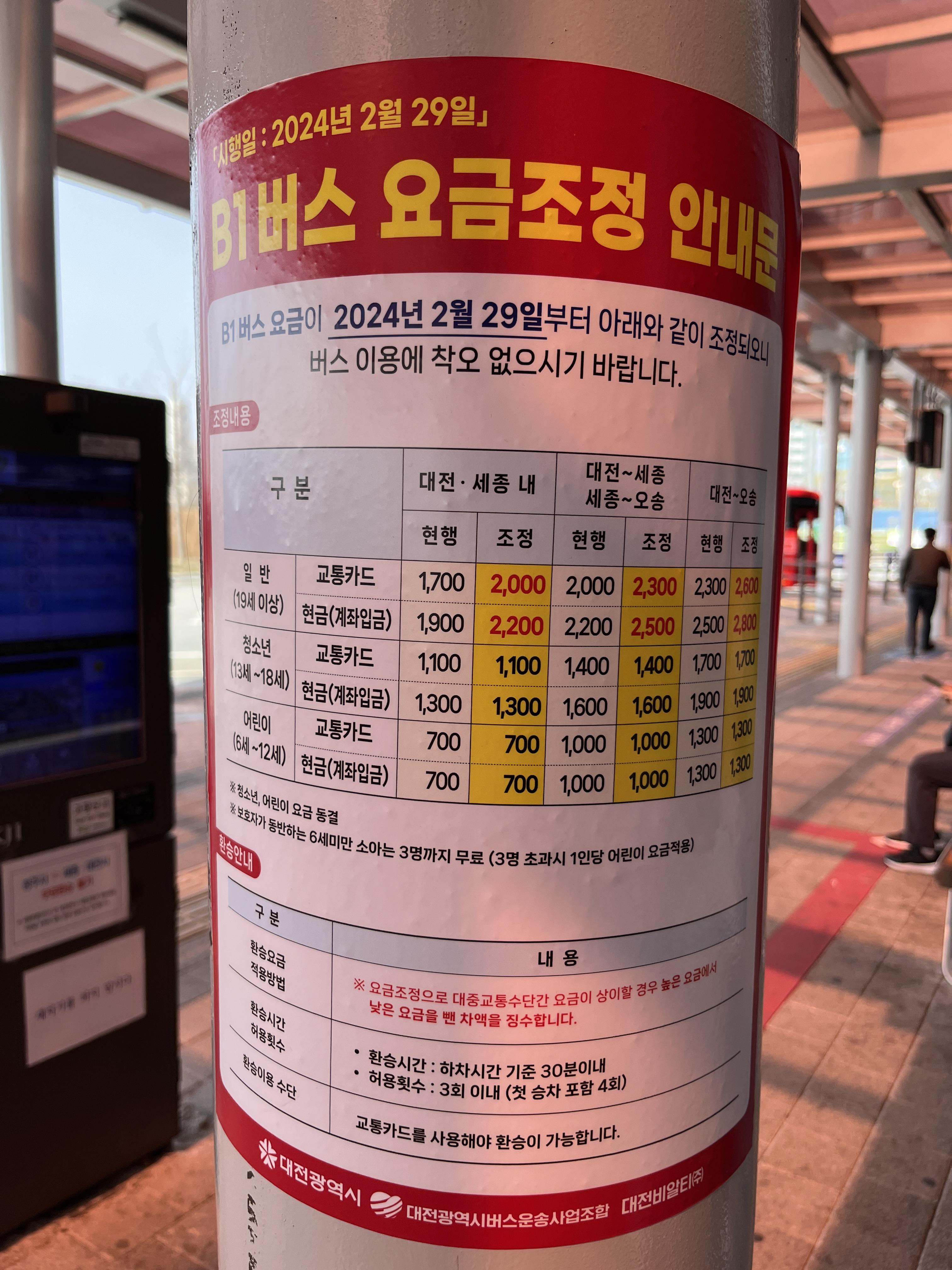 대전·세종·오송 B버스 요금 (교통카드 기준)