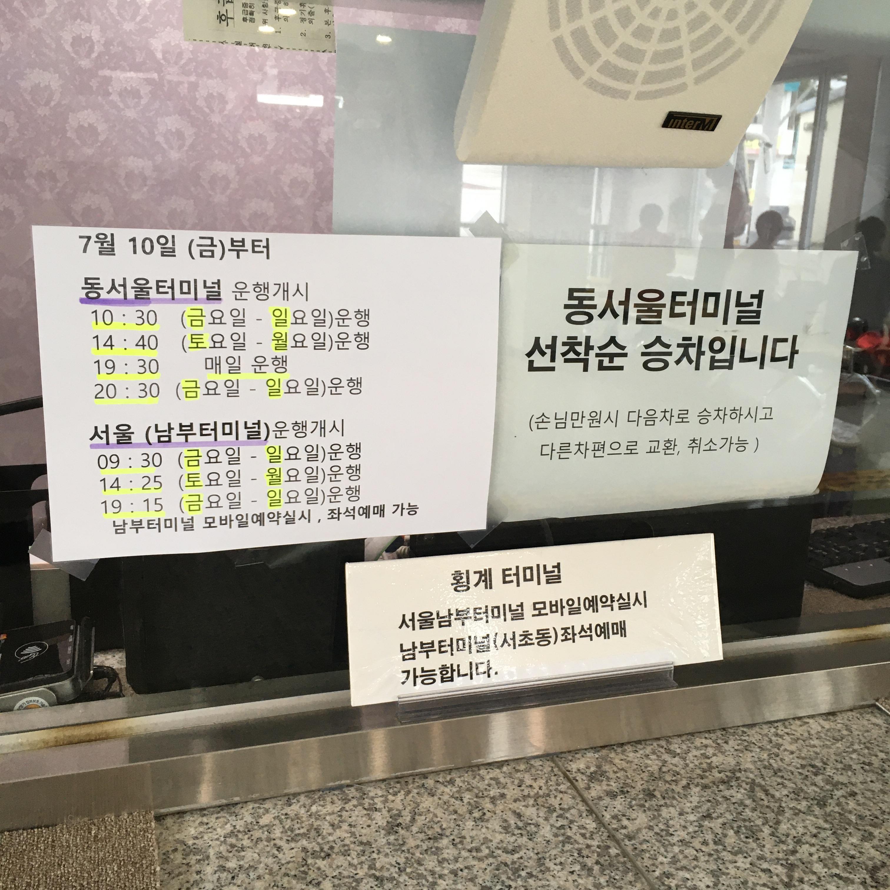 서울(동서울, 남부), 원주, 춘천, 안산, 강릉 등 모든 자리 확인 및 예약 불가, 선착순 승차