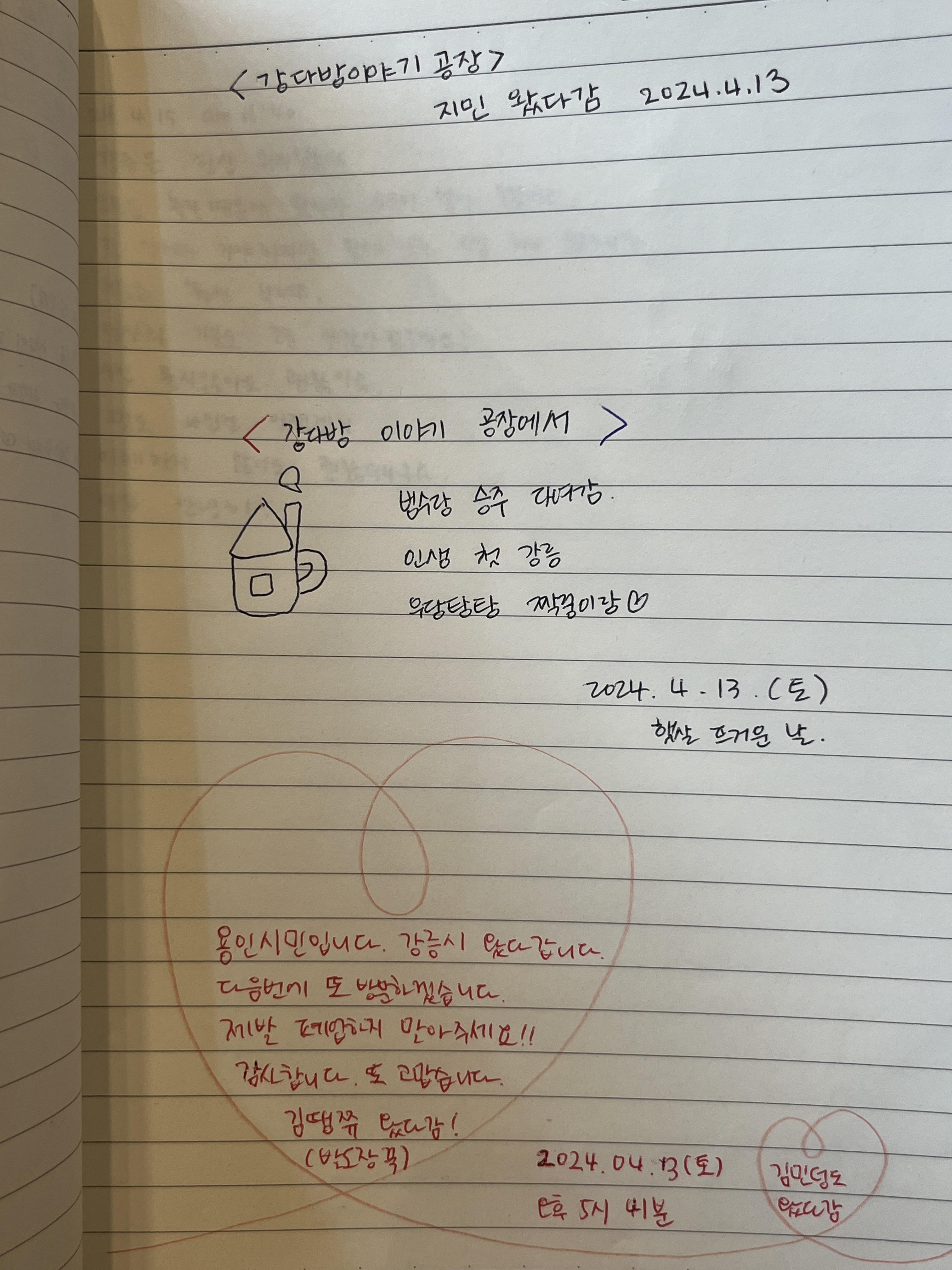 | 2024년 6월 강다방 이야기공장 방명록 (3) | 2024.07.02 |
