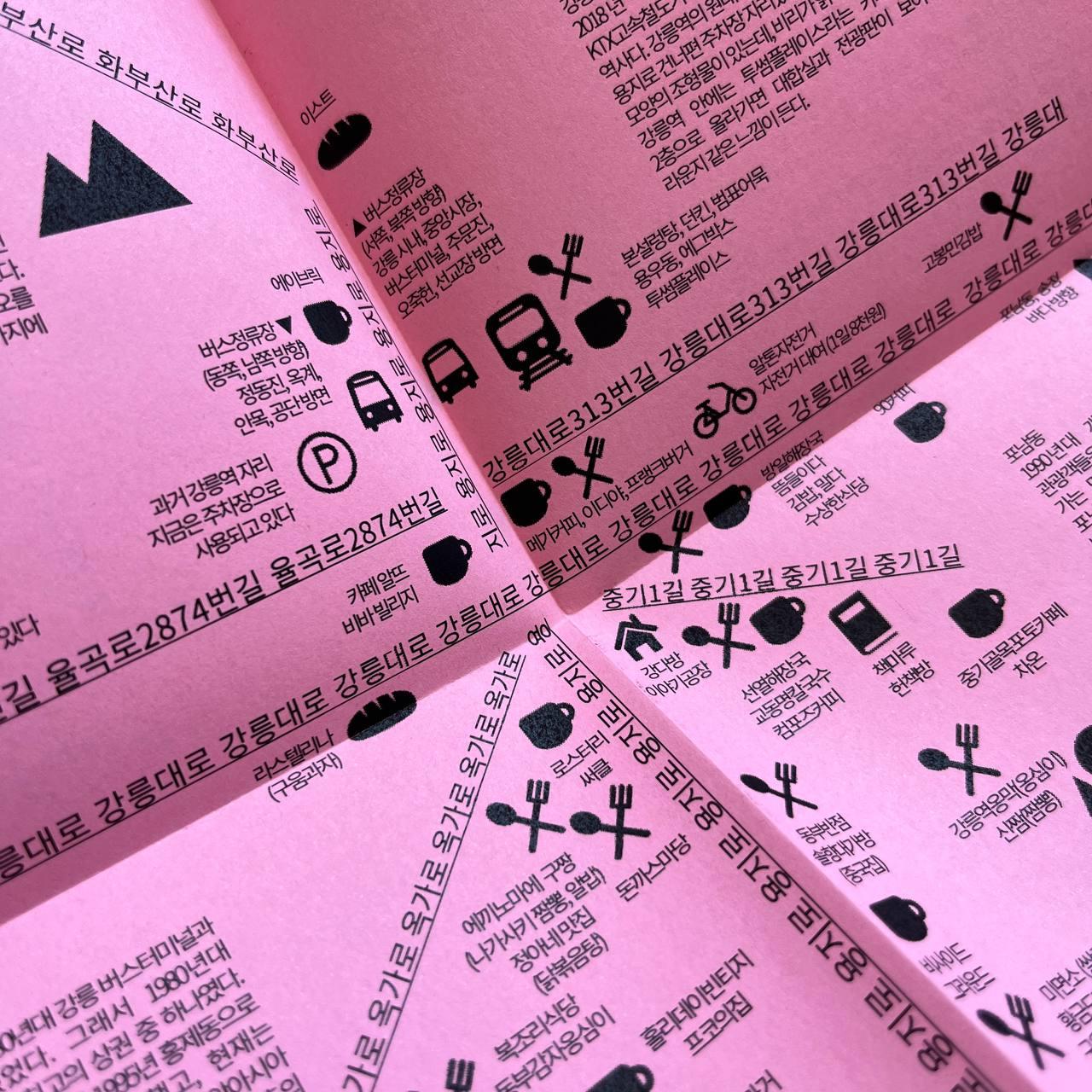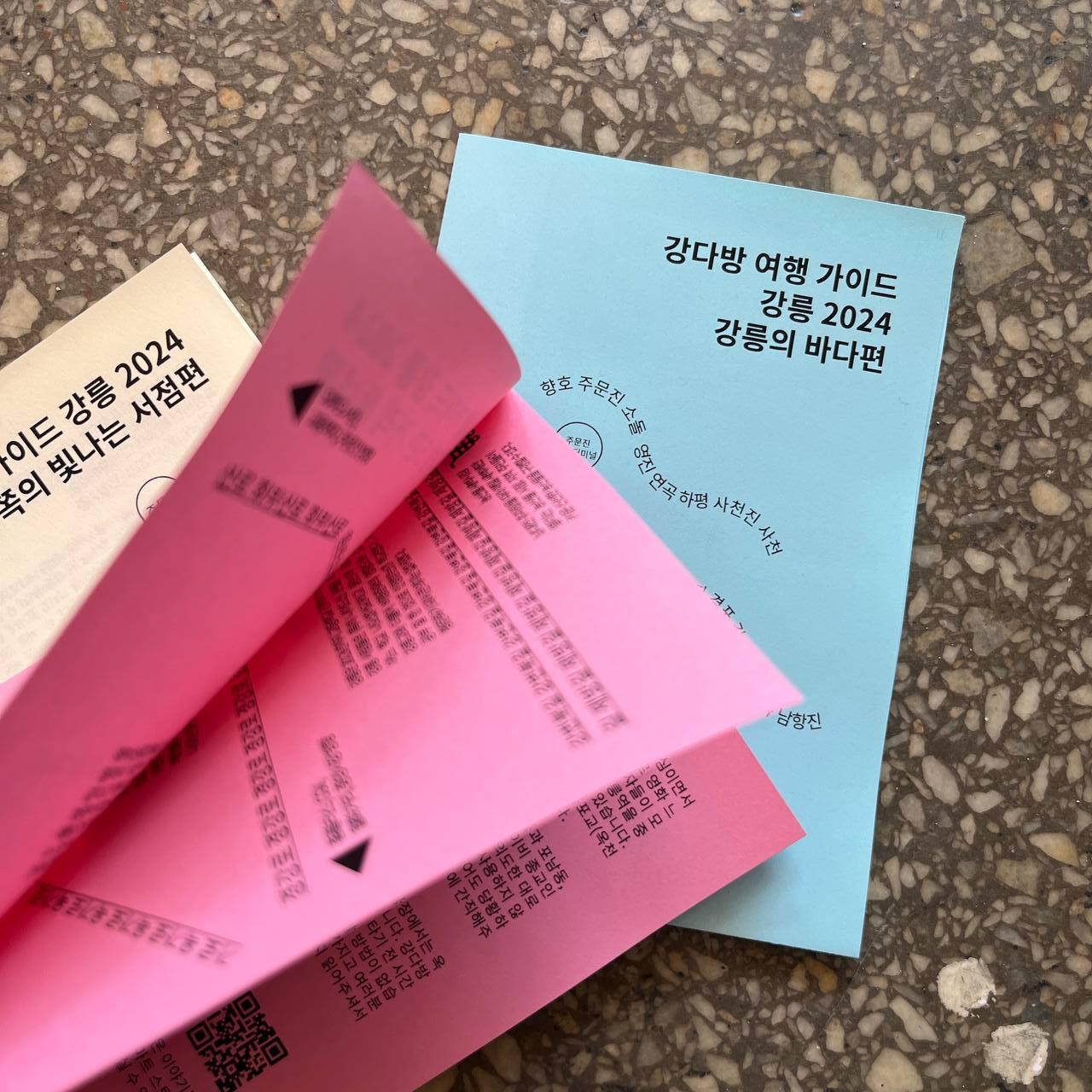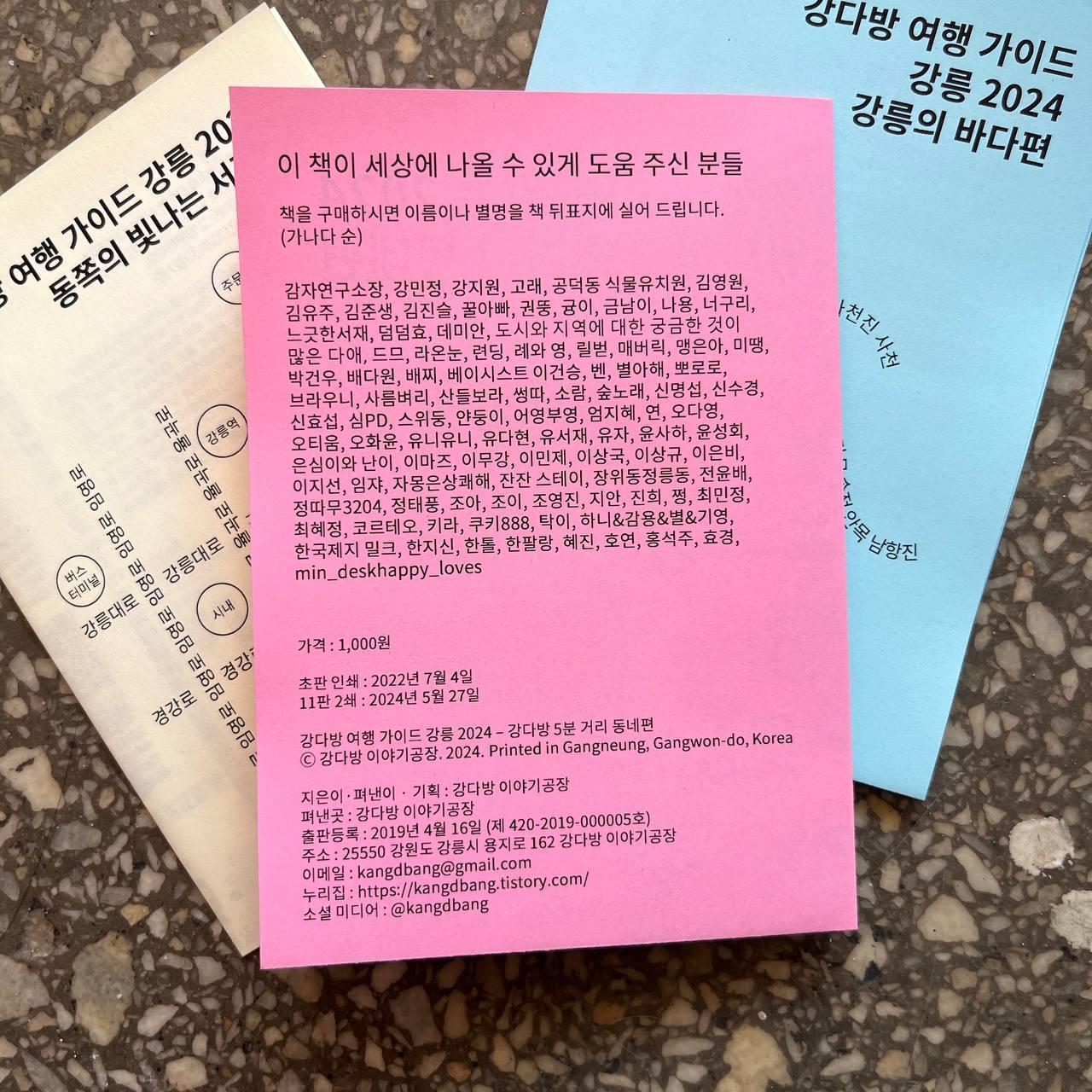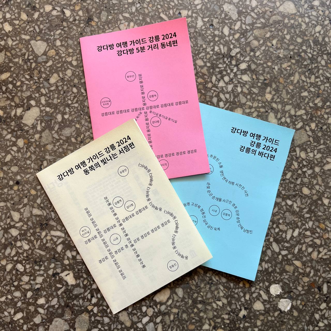 강다방 이야기공장에서 제작한 한 장짜리 여행 가이드북. 실제로 존재하는지 모르는 강사모(강다방 이야기공장을 사랑하는 모임)에서 선정한 2024년 올해의 책이기도 하다. 강다방 주변 5분 지도부터 강릉 서점 지도, 강릉의 바다 지도편으로 구성되어 있다. 책 마지막 장에는 강다방 여행 가이드 강릉을 구매해주신 분들의 이름 또는 별명이 적혀있다. 이 책을 구매하면 이름 또는 별명을 함께 적어주니 참고 할 것.