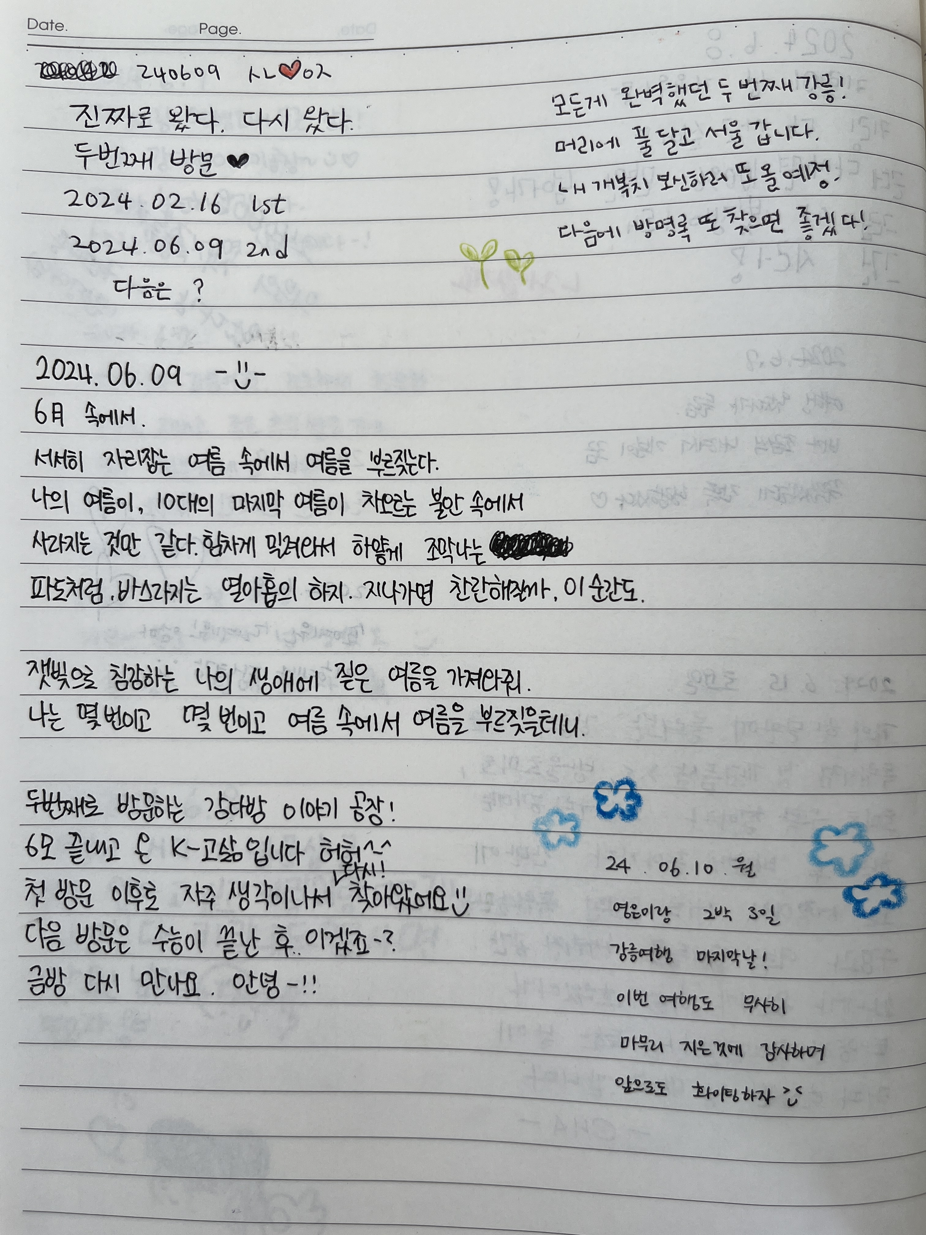 | 2024년 7월 강다방 이야기공장 방명록 (0) | 2024.08.27 |