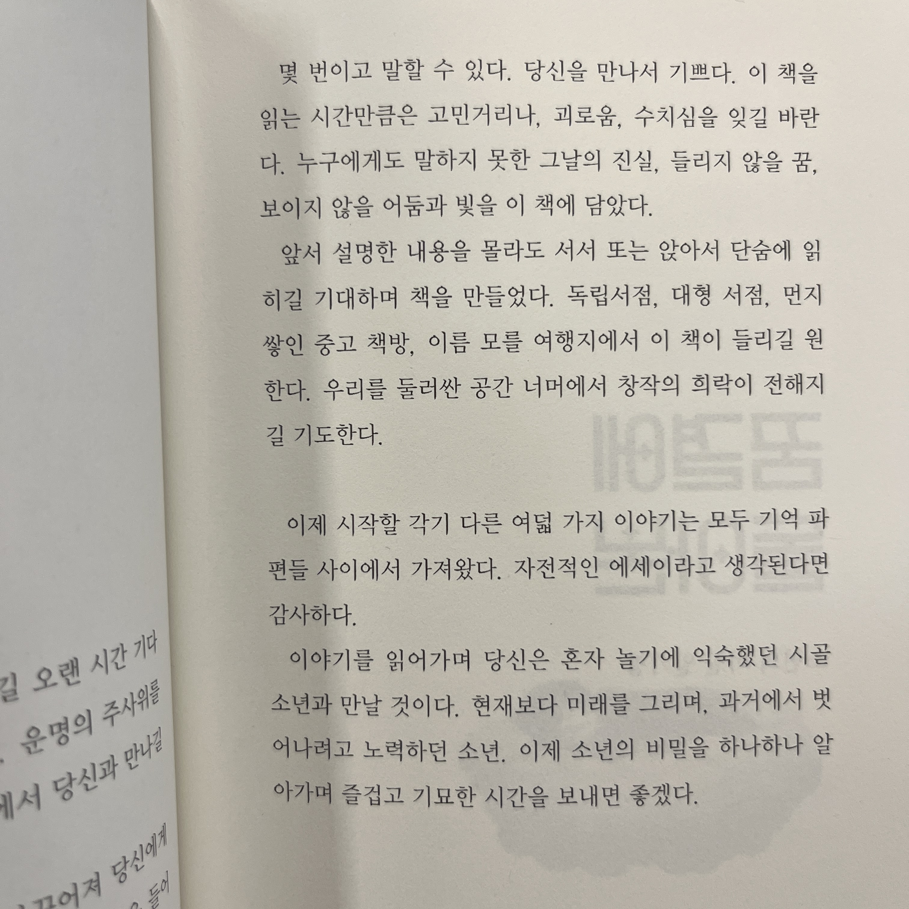 몇 번이고 말할 수 있다. 당신을 만나서 기쁘다. 이 책을 읽는 시간만큼은 고민거리나, 괴로움, 수치심을 잊길 바란다. 누구에게도 말하지 못한 그날의 진실, 들리지 않을 꿈, 보이지 않을 어둠과 빛을 이 책에 담았다.