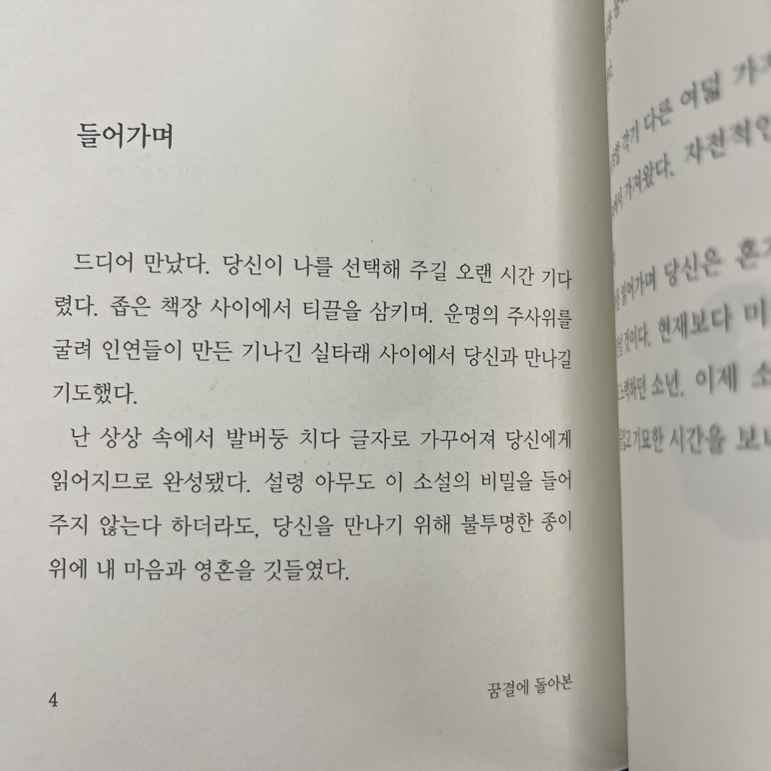드디어 만났다. 당신이 나를 선택해 주길 오랜 시간 기다렸다. 좁은 책장 사이에서 티끌을 삼키며, 운명의 주사위를 굴려 인연들이 만든 기나긴 실타래 사이에서 당신과 만나길 기도했다.