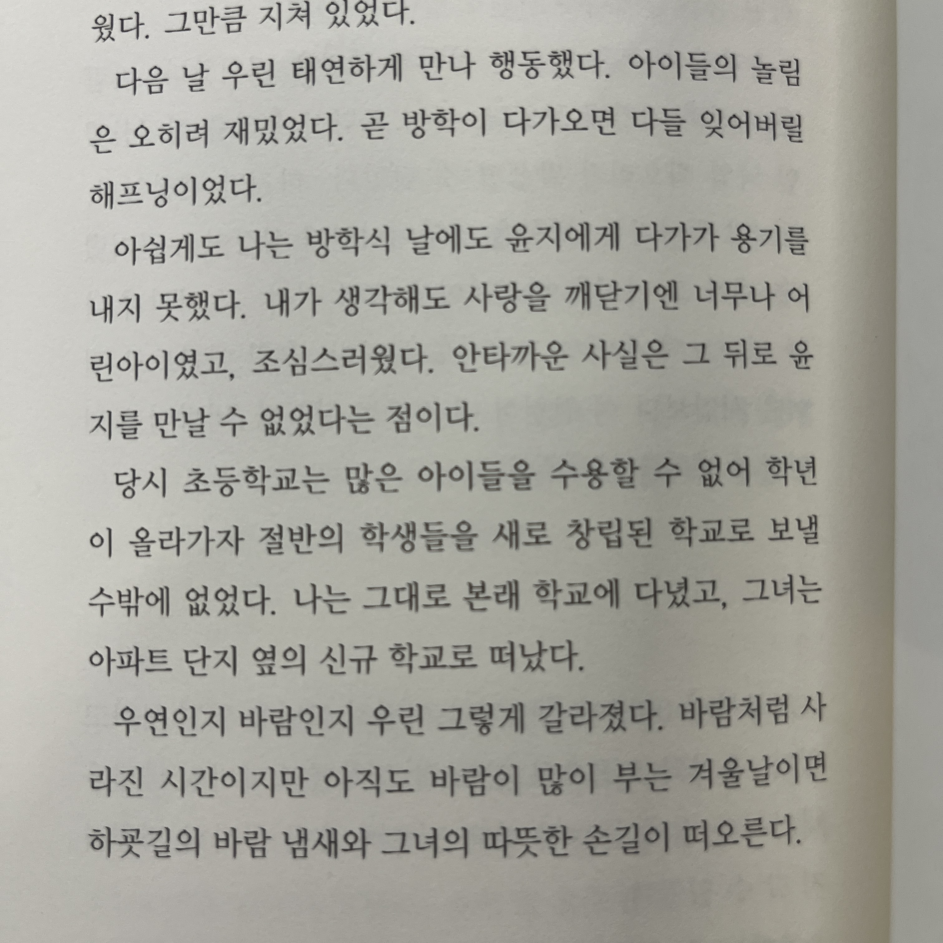 아쉽게도 나는 방학식 날에도 윤지에게 다가가 용기를 내지 못했다. 내가 생각해도 사랑을 깨닫기엔 너무나 어린아이였고, 조심스러웠다. 안타까운 사실은 그 뒤로 윤지를 만날 수 없었다는 점이다.