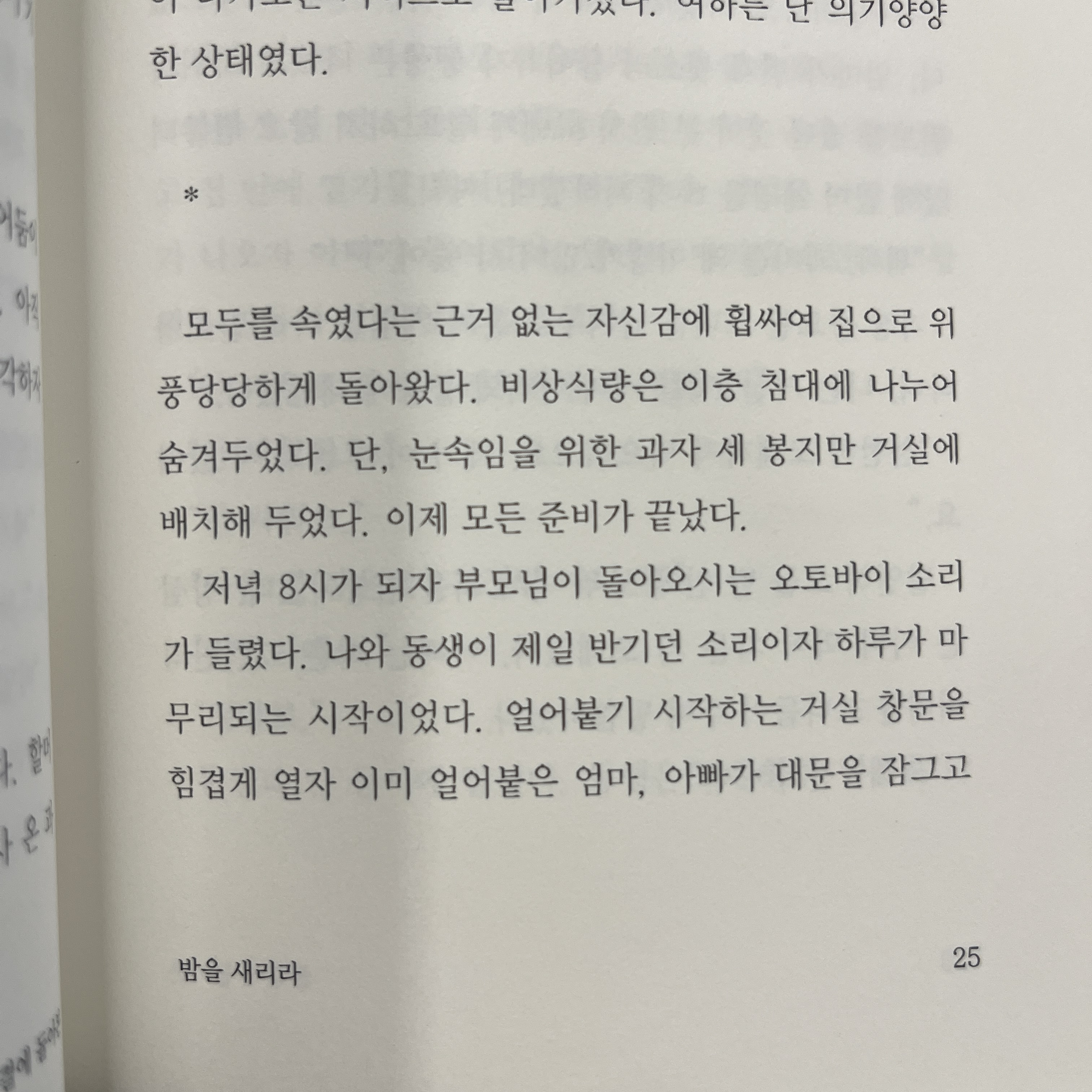 저녁 8시가 되자 부모님이 돌아오시는 오토바이 소리가 들렸다. 나와 동생이 제일 반기던 소리이자 하루가 마무리되는 시작이었다. 얼어붙기 시작하는 거실 창문을 힘겹게 열자 이미 얼어붙은 엄마, 아빠가 대문을 잠그고...