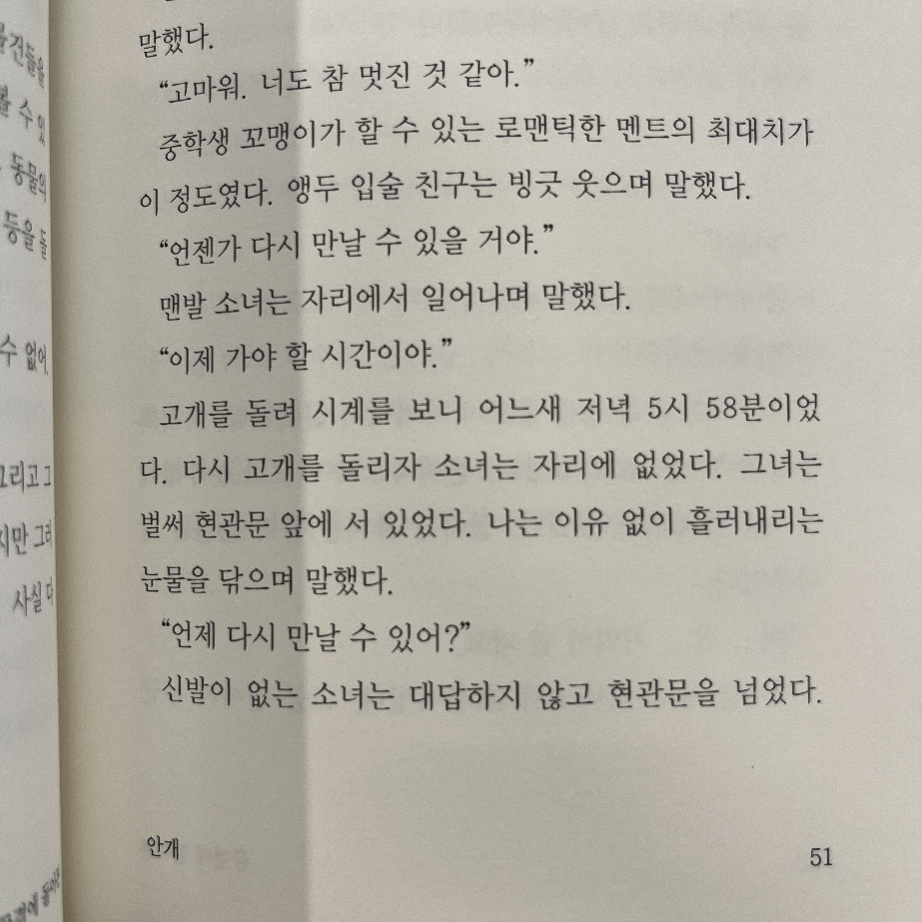 고개를 돌려 시계를 보니 어느새 저녁 5시 58분이었다. 다시 고개를 돌리자 소녀는 자리에 없었다. 그녀는 벌써 현관문 앞에 서 있었다. 나는 이유 없이 흘러내리는 눈물을 닦으며 말했다.