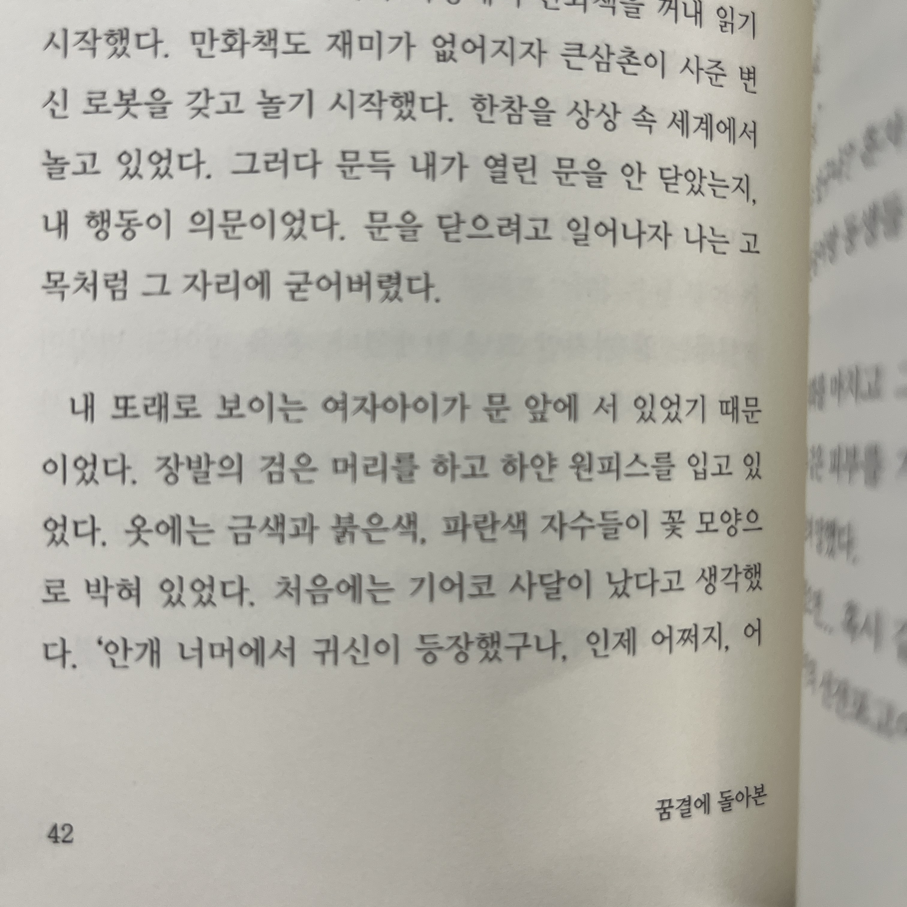 내 또래로 보이는 여자아이가 문 앞에 서 있었기 때문이었다. 장발의 검은 머리를 하고 하얀 원피스를 입고 있었다. 옷에는 금색과 붉은색, 파란색 자수들이 꽃 모양으로 박혀 있었다. 처음에는 기어코 사달이 났다고 생각했다. '안개 너머에서 귀신이 등장했구나. 인제 어쩌지...