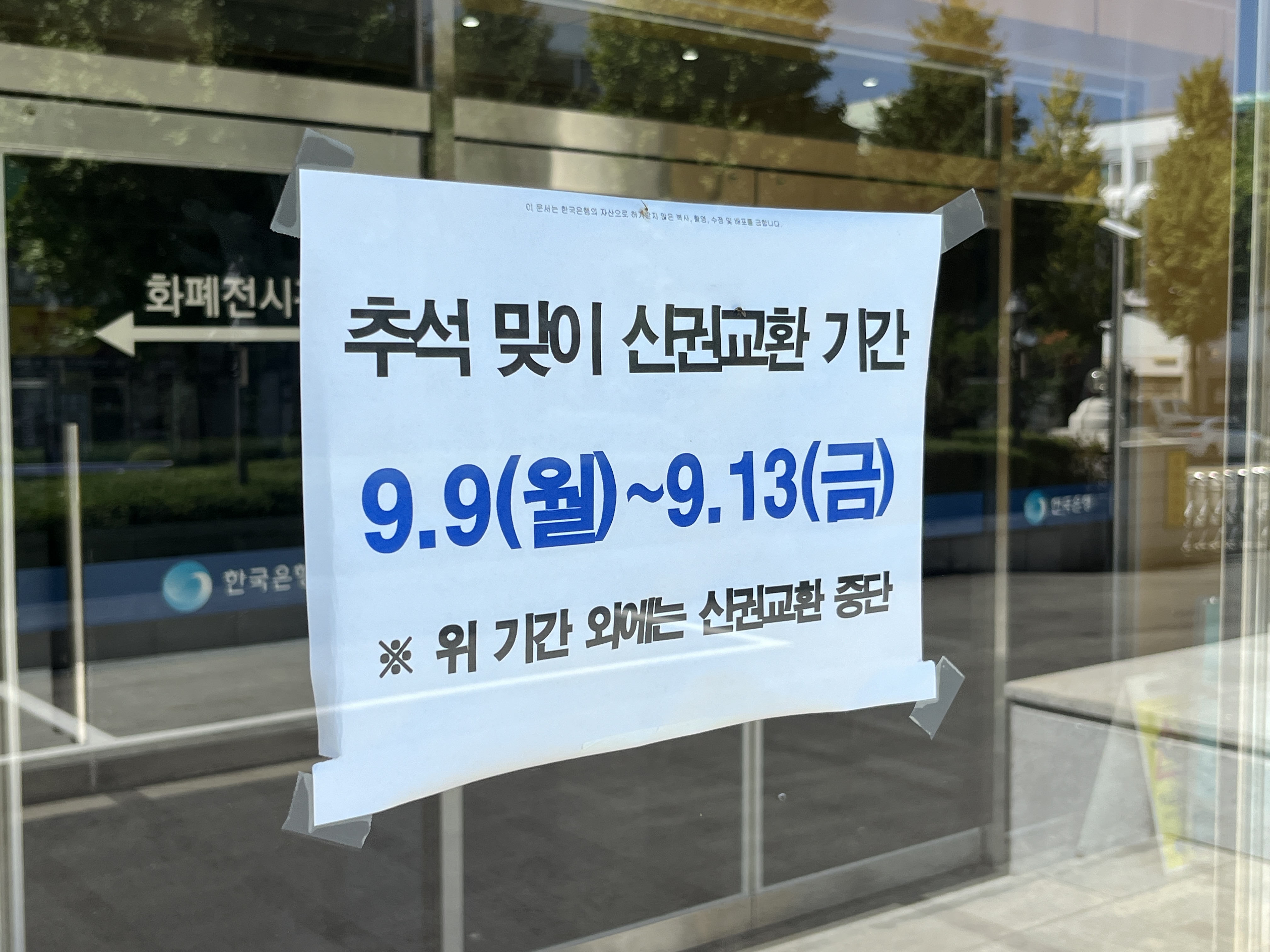 위 기간 중에는 신권교환 외에 동전 교환 및 일상적인 교환업무를 중단하오니 양해 바랍니다.