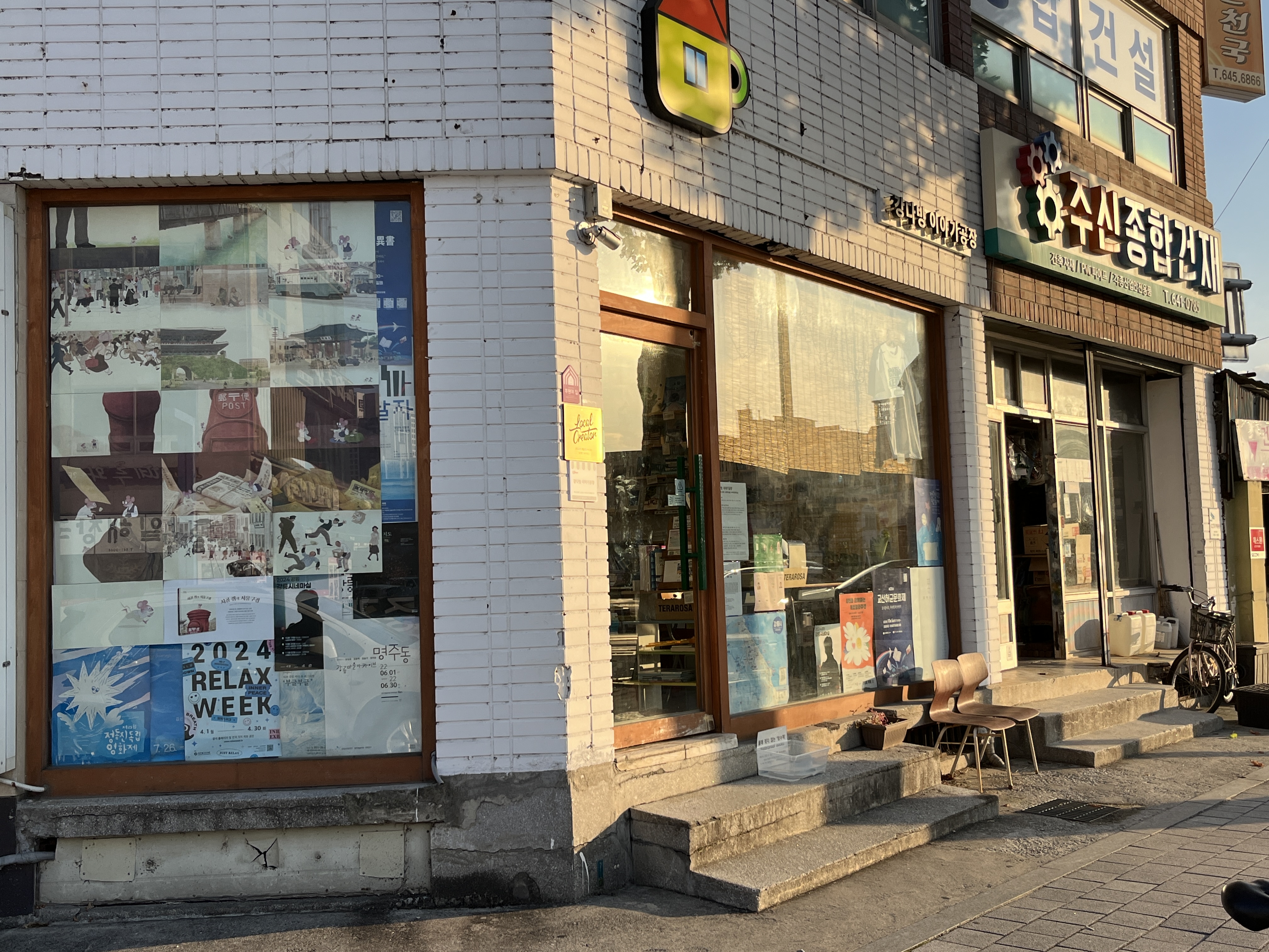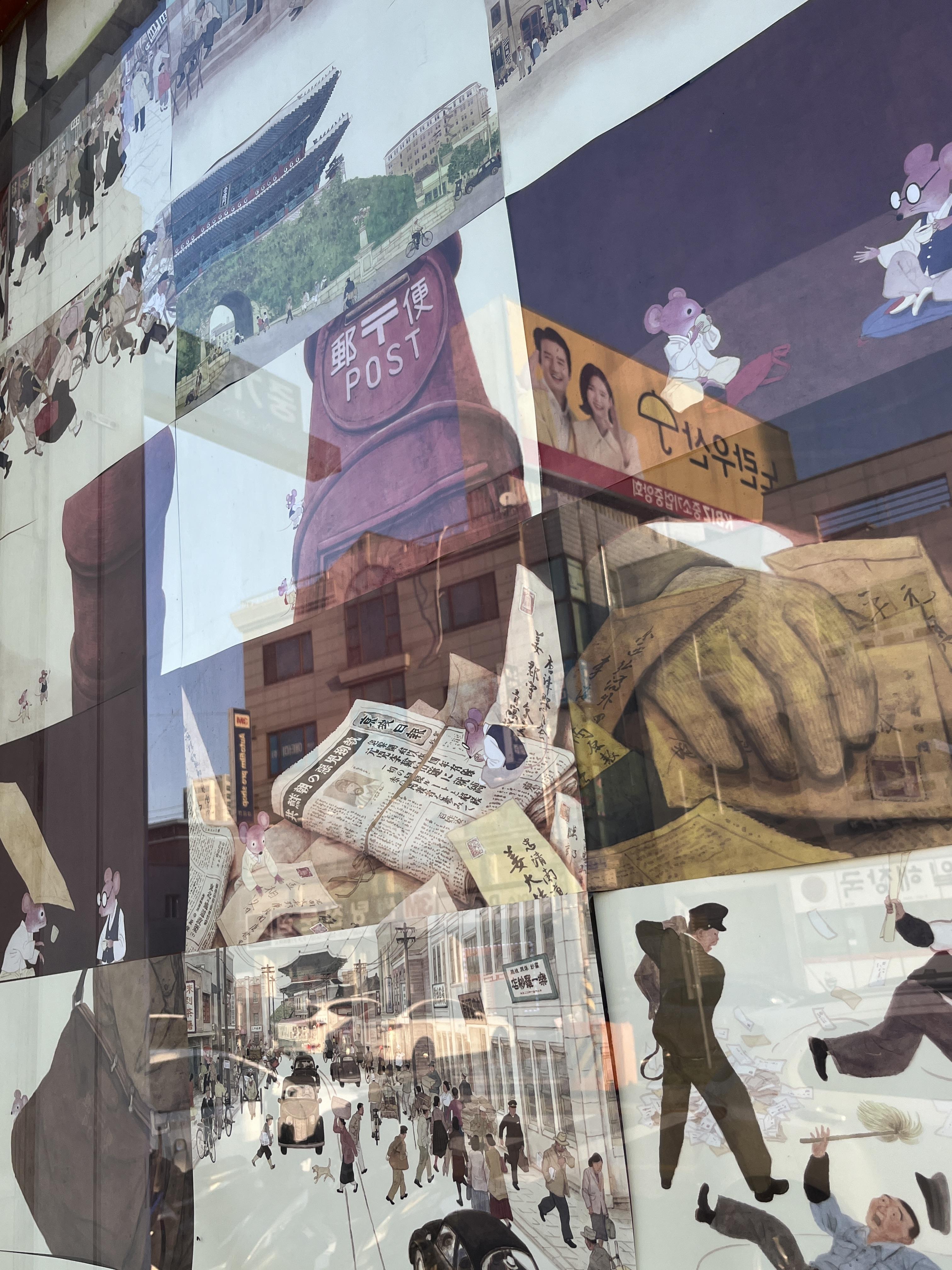 강다방 외부 창문 한쪽 전체를 출판사 길벗어린이(@gilbutkid_book)의 도서 ‘시골 쥐의 서울 구경’ 속에 있는 그림들로 채워봤습니다. 오가며 그림책 속 원화를 구경해보세요. 🖼