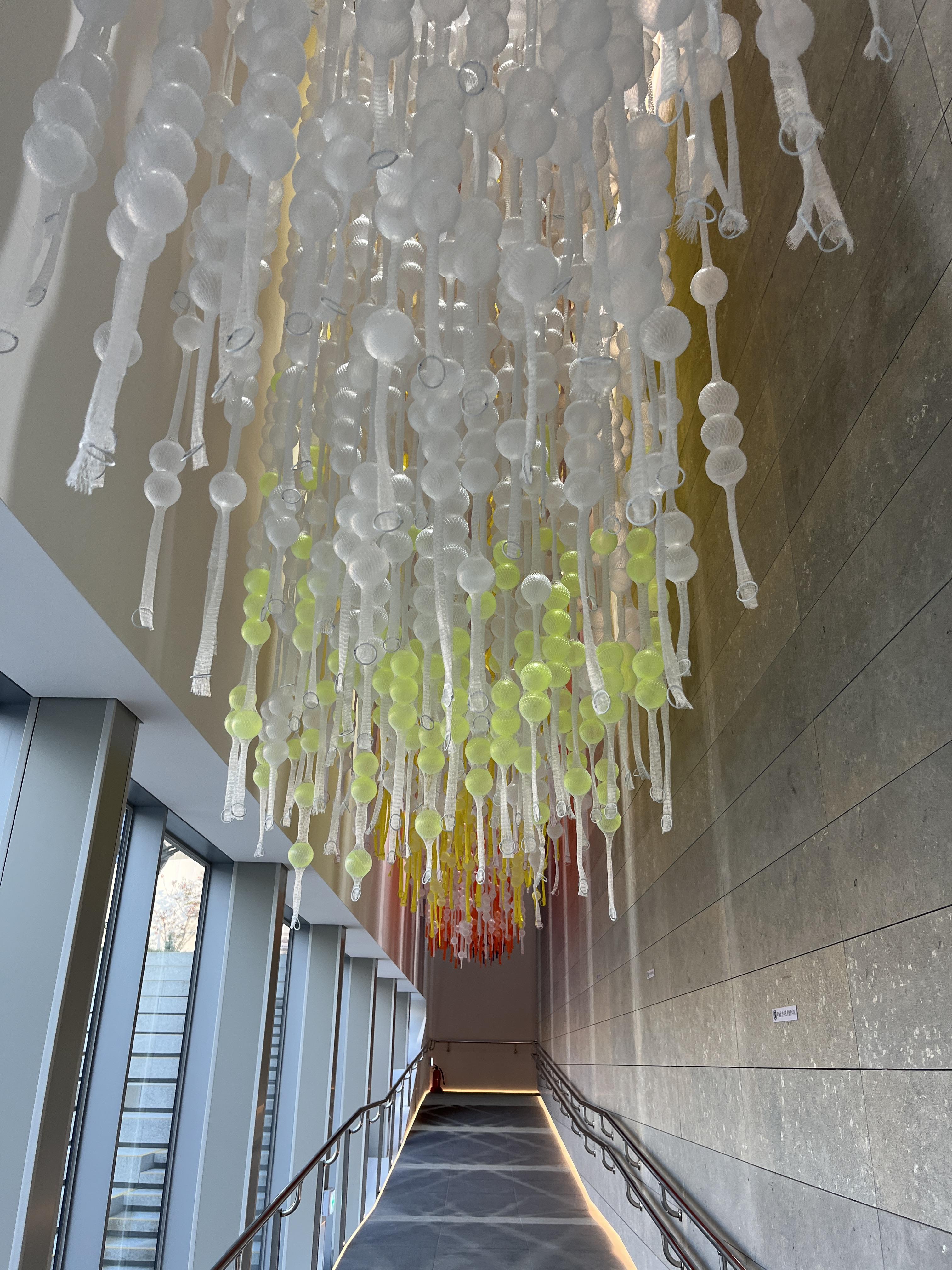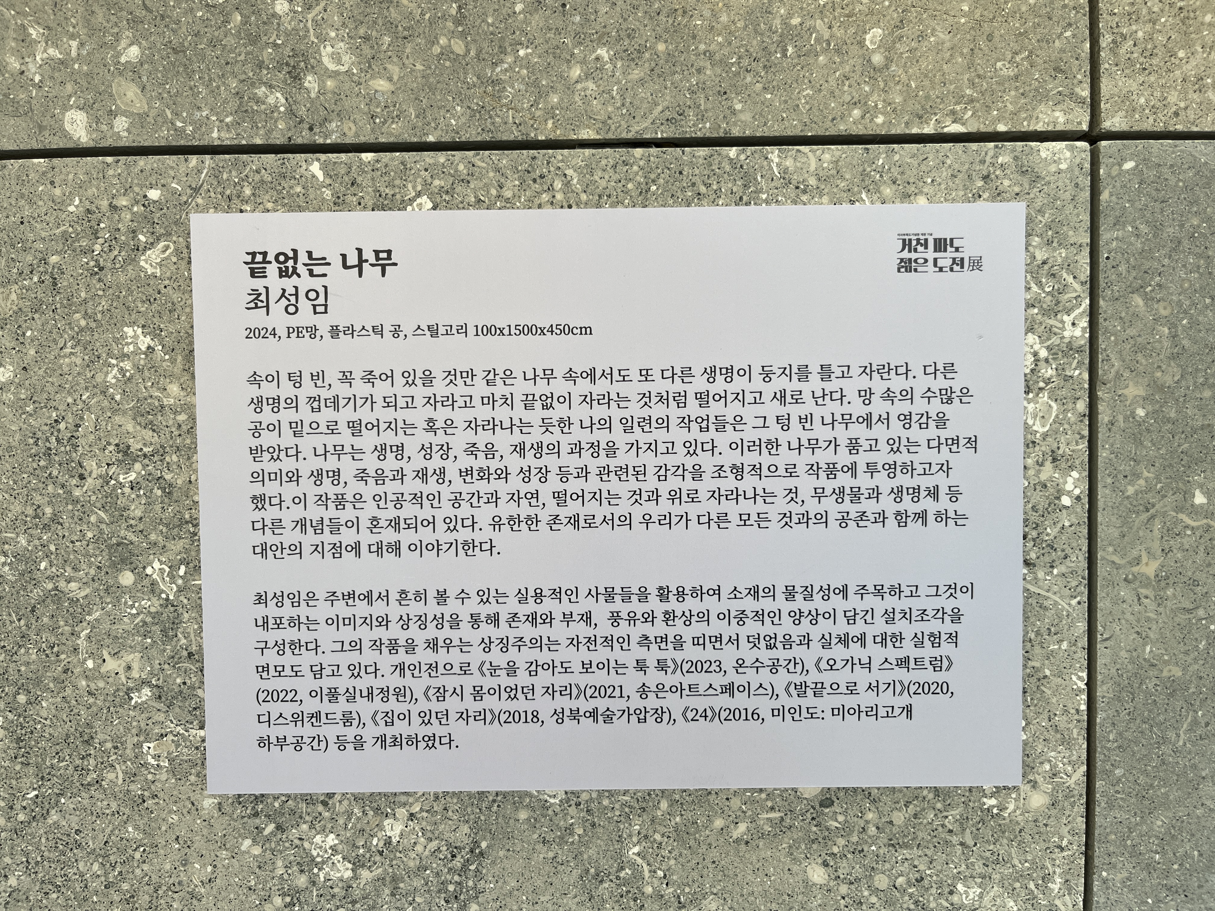 속이 텅 빈, 꼭 죽어 있을 것만 같은 나무 속에서도 또 다른 생명이 둥지를 틀고 자란다. 다른 생명의 껍데기가 되고 자라고 마치 끝없이 자라는 것처럼 떨어지고 새로 난다. 망 속의 수많은 공이 밑으로 떨어지는 혹은 자라나는 듯한 나의 일련의 작업들은 그 텅 빈 나무에서 영감을 받았다. 나무는 생명, 성장, 죽음, 재생의 과정을 가지고 있다. 이러한 나무가 품고 있는 다면적 의미와 생명, 죽음과 재생, 변화와 성장 등과 관련된 감각을 조형적으로 작품에 투영하고자 했다. 이 작품은 인공적인 공간과 자연, 떨어지는 것과 위로 자라나는 것, 무생물과 생명체 등 다른 개념들이 혼재되어 있다. 유한한 존재로서의 우리가 다른 모든 것과의 공존과 함께 하는 대안의 지점에 대해 이야기한다.