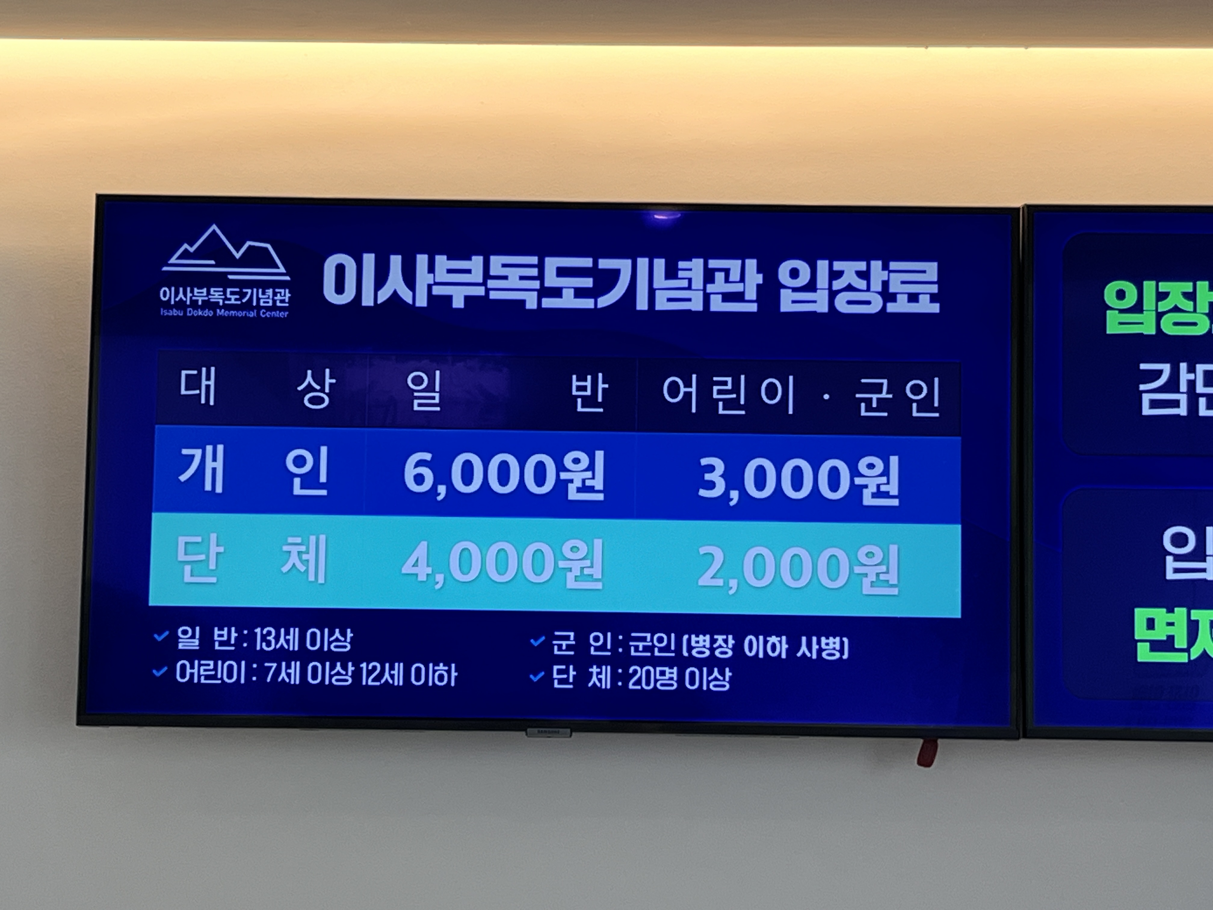 면제 대상 : 6세 이하의 아동, 단체 입장시 인솔자(어린이집, 유치원, 초등학생), 국가유공자(본인/배우자), 장애인(중증)/보조인 1명