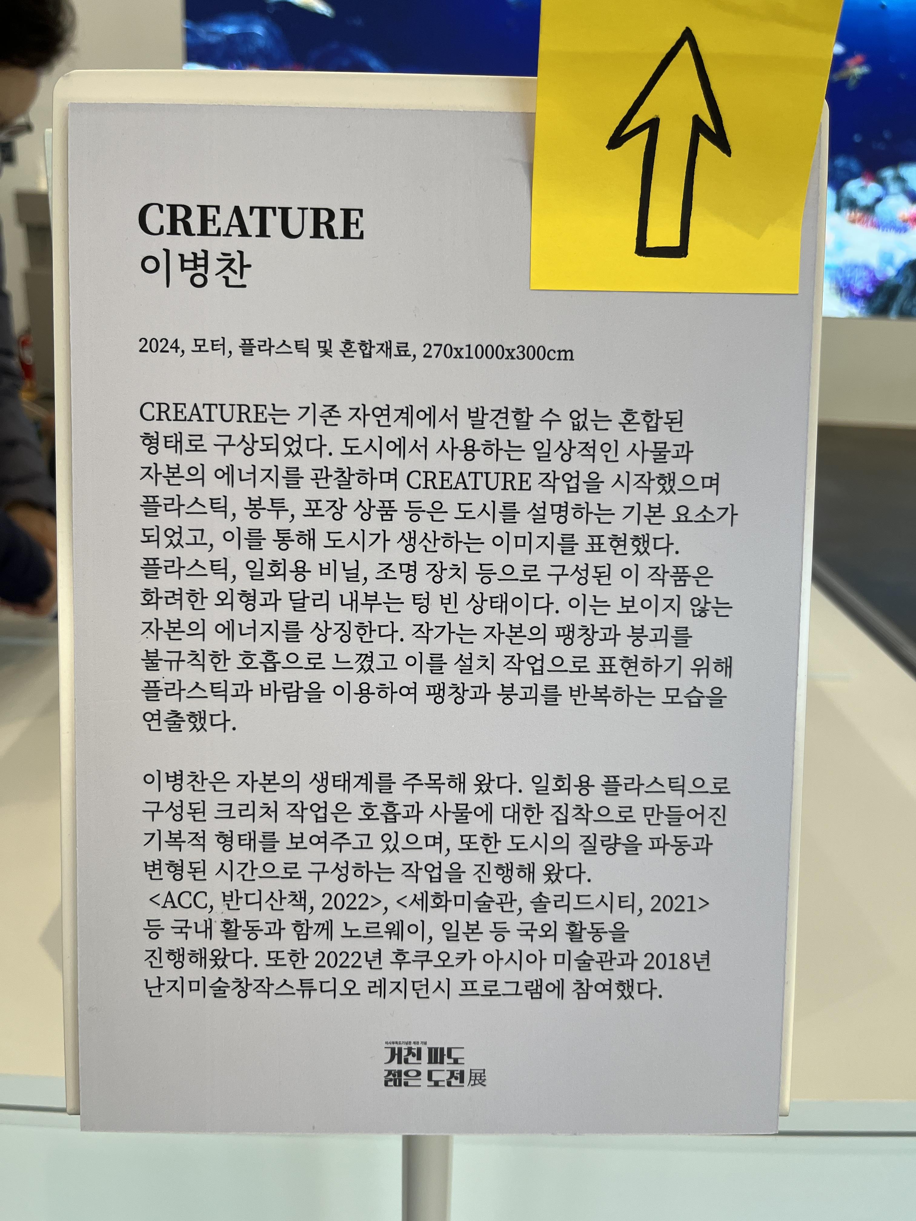 CREATURE는 기존 자연계에서 발견할 수 없는 혼합된 형태로 구상되었다. 도시에서 사용하는 일상적인 사물과 자본의 에너지를 관찰하며 CREATURE 작업을 시작했으며 플라스틱, 봉투, 포장상품 등은 도시를 설명하는 기본 요소가 되었고, 이를 통해 도시가 생산하는 이미지를 표현했다. 플라스틱, 일회용 비닐, 조명 장치 등으로 구성된 이 작품은 화려한 외형과 달리 내부는 텅 빈 상태이다. 이는 보이지 않는 자본의 에너지를 상징한다. 작가는 자본의 팽창과 붕괴를 불규칙한 호흡으로 느꼈고 이를 설치 작업으로 표현하기 위해 플라스틱과 바람을 이용하여 팽창과 붕괴를 반복하는 모습을 연출했다.
